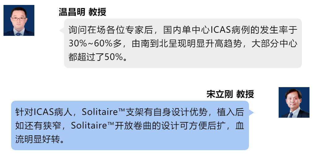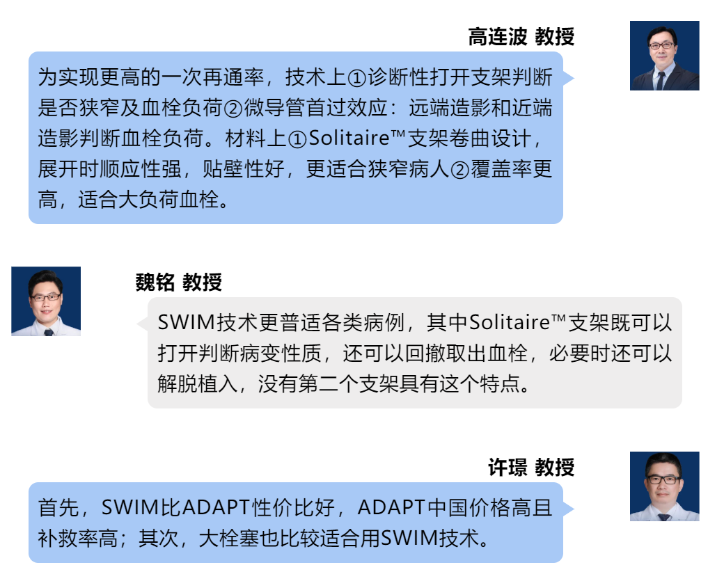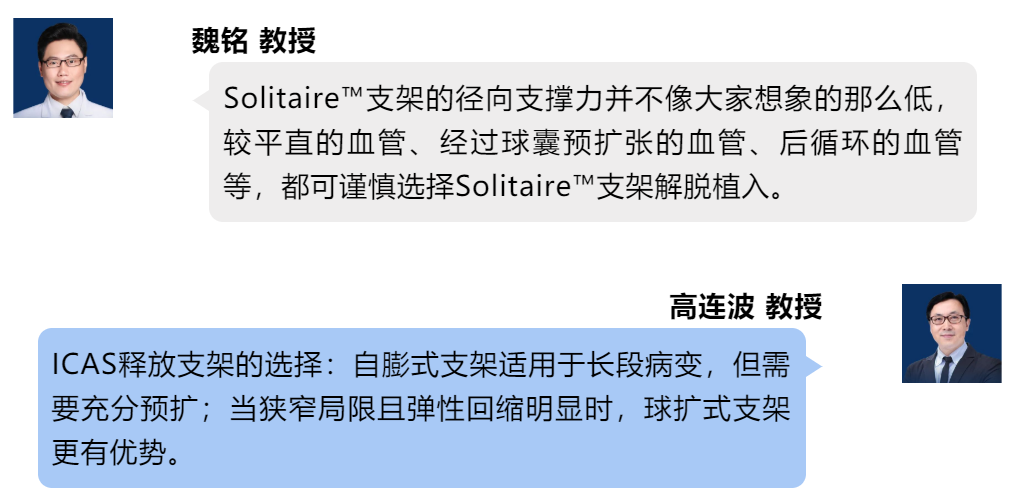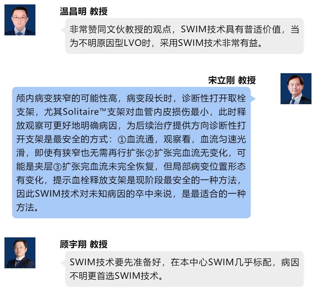 魏铭教授指出,病因诊断是一个无限接近真相的过程,必须以病变性质预判为基础,实现最少取栓次数、最短手术时间和最高的技术成功率。中国人群具有高潜在动脉粥样的特点,在充分预判后,前、后循环病变均应以SWIM技术为基础,结合药物、支架或球囊治疗。前循环闭塞时,通过微导管、微导丝前期到位、造影,Solitire™支架诊断性释放,尤其铂金版的12个标记显影位点,将支架体均分为4个有效工作区域,可明确是否ICAS病变,之后再选择球囊或支架植入。后循环闭塞时,Solitaire™支架释放同时可运用溶栓药物,必要时还可解脱植入后循环病变处,在保留穿支的情况下最大限度地改善患者预后。颅内颅外串联病变引起闭塞时,SWIM技术灵活多变,更符合手术中随机应变的需求。栓塞、大负荷血栓时,应将支架取栓和抽吸相结合,不同手段结合运用达到最佳疗效。