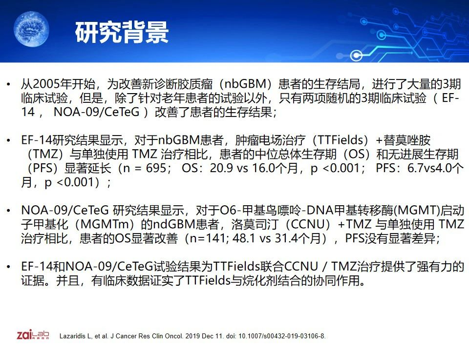 全球研究者对于治疗胶质母细胞瘤(GBM)的临床研究和探索从未停止过,但近十年来,只有两项三期临床研究得到了总生存的获益,分别是EF-14试验和CeTeG/NOA-09试验,那么基于这两项临床试验,近期又有了一些新的临床研究进展,本期GBM前沿邀请来自苏州大学附属第一医院神经外科的黄煜伦教授为大家分享“两项新诊断GBM的临床研究结果”。