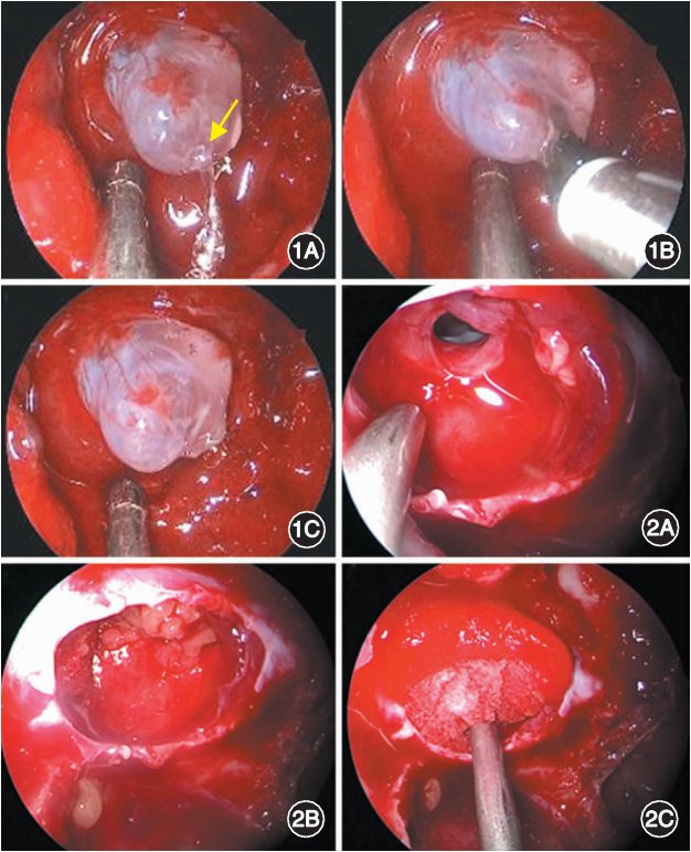 2.颅底重建的指征和分级标准:术中行颅底重建的指征包括,(1)鞍内肿瘤切除后鞍膈菲薄或鞍结节处蛛网膜隐窝呈裂隙状开放。(2)垂体腺瘤或脊索瘤等向硬膜内生长,突破鞍膈和颅底硬膜,肿瘤切除后鞍膈和颅底硬膜出现缺损。(3)神经内镜经鼻扩大入路切除颅咽管瘤、鞍区脑膜瘤等,因需行颅底硬膜开窗而导致颅底缺损。本中心根据硬膜缺损直径和脑脊液流量将颅底缺损分为3级:Ⅰ级,硬膜缺损仅为裂隙状或小孔状,少量脑脊液渗漏;Ⅱ级,硬膜缺损直径≤5mm,有明显的脑脊液漏;Ⅲ级,硬膜缺损直径>5mm,有大量脑脊液漏出。