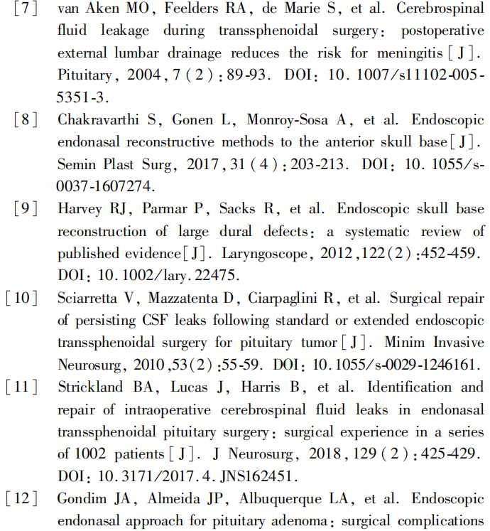 1.对颅底缺损准确评级并严密封闭漏口:目前,国内外神经内镜经鼻入路颅底手术中广泛认同采用人工硬脑膜、自体脂肪、自体筋膜、肌肉、游离鼻中甲黏膜瓣、带蒂鼻中隔黏膜瓣等材料修补颅底缺损,特别是对经鼻扩大入路出现的伴有高流量脑脊液漏的Ⅲ级颅底缺损具有切实可靠的修补效果[9]。该修补方法旨在利用不同修补材料的生物学特性,如脂肪具有疏水性,可起到水封作用;自体筋膜坚韧、吸收缓慢、易存活;带蒂鼻中隔黏膜瓣血供保留完整、生长快速、覆盖面广且贴合紧密等。将以上材料单用或者联合应用可显著提高颅底重建的成功率。Strickland等[11]对1002例经蝶垂体腺瘤切除术中出现颅底缺损的患者采用自体脂肪填塞、自体筋膜覆盖、生物胶封闭的修补策略,修补成功率达到97.4%。Gondim等[12]对301例垂体腺瘤切除术中出现的低流量颅底缺损患者采用人工硬膜内衬、自体脂肪填充、自体筋膜覆盖;对高流量颅底缺损的患者再辅以带蒂鼻中隔黏膜瓣外部支撑的方法,修补成功率达到98.4%。