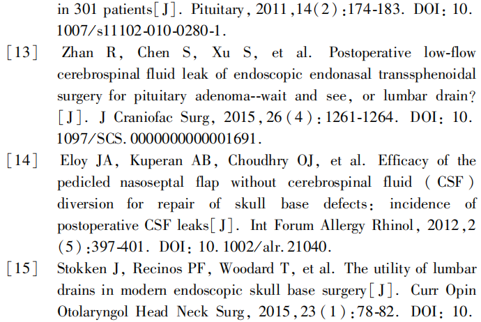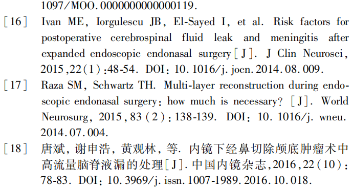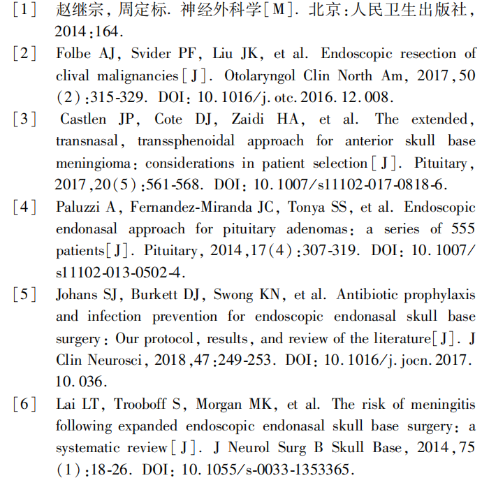 3.严格的术后管理及护理宣教:严格的术后管理及全面的护理宣教也是影响脑脊液漏修补成功率的重要因素。颅内感染是经鼻颅底手术后的常见并发症,第一、二代头孢菌素难以通过血-脑屏障,脑脊液浓度低,抗感染效果不佳。因此,对于术中Ⅱ~Ⅲ级的颅底缺损者,建议使用第三代头孢菌素(头孢他啶、头孢曲松),必要时可联合美罗培南及万古霉素[18]。同时应重视对患者及家属的术后宣教,指导患者适量活动,严格避免患者情绪激动及过度用力,如弯腰提重物、剧烈咳嗽、用力大便等可能增加颅内压的动作;对排便困难的患者早期使用导泻剂、乳果糖等。