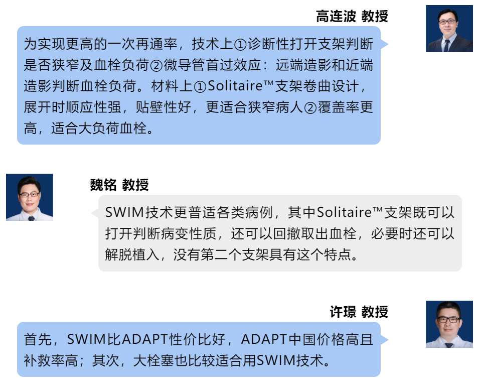 于中国沃土诞生的SWIM技术,以循证基石Solitaire™支架为基础,辅助导管负压抽吸,站在循证巨人的肩膀上,取各方优势于一体,是唯一能够应对各种病因、病变大血管闭塞性急性缺血性卒中的利器。即使对不明病因的急性缺血性卒中患者,SWIM技术也可完全地应变,兔子偏由狮子搏,在充分保障安全性的前提下帮助术者达到最大的疗效,最大限度地提升广大卒中患者的临床预后。