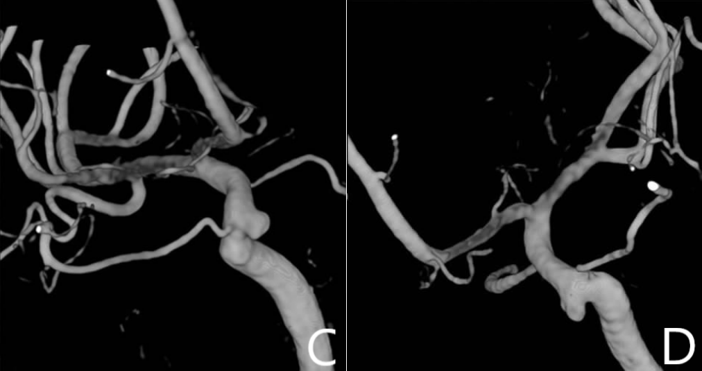 图2. 脑血管造影提示双侧颈内动脉眼动脉段动脉瘤。