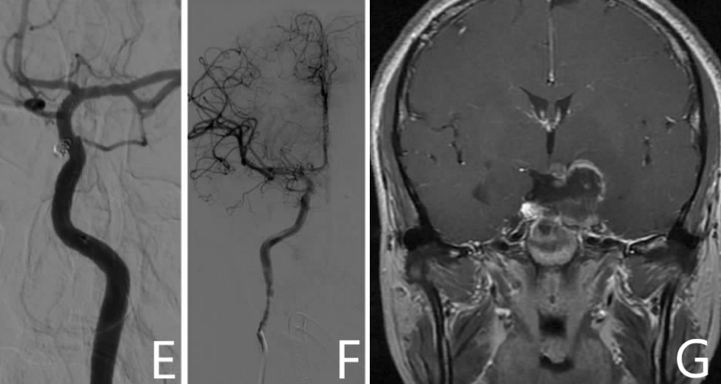 图3. E,F:术后造影显示双侧颈内动脉眼动脉段动脉瘤栓塞完全。G:术后肿瘤完全切除。