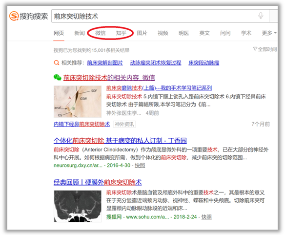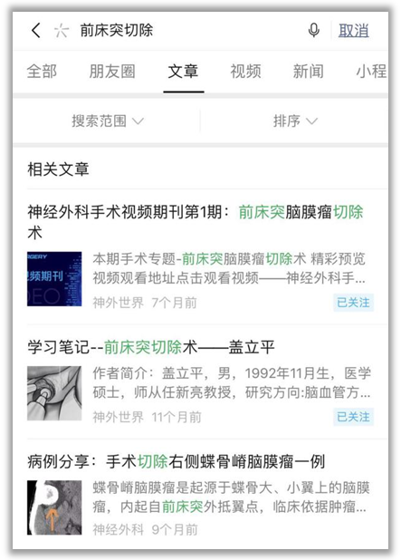 笔者曾写过一篇帖子《查医学知识,你还在用百度吗》,笔者建议医学工作者可以好好利用手机微信的搜索功能。中国目前处于一个全民自媒体的时代,尤其2020年由于疫情原因,网络授课非常普及,利用微信搜索我们可以查到《神外资讯》《神外世界》《神外前沿》《蛇牌学院》等等高质量的公众号文章,不仅有文字版,更有网络直播、视频教学,并且这是百度无法搜索到的。