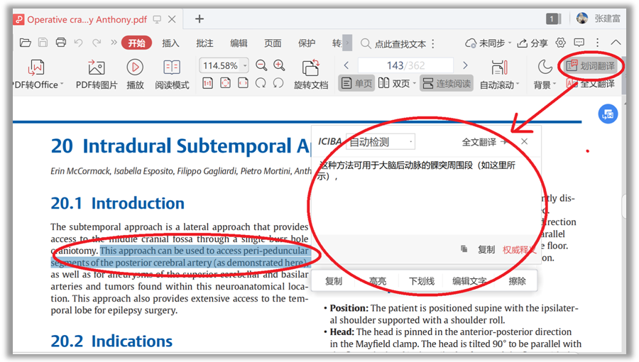 如果是英文pdf文献,我们经常需要查询某个单词的意思,使用WPS OFFICE的“划词翻译”功能即可。