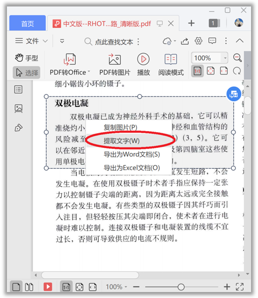 下载的中文 pdf版 电子书或文献,很多是无法直接复制黏贴的,这时就需要一款pdf文字识别软件,笔者推荐WPS OFFICE。选取需要识别的文字,点击“提取文字”即可。