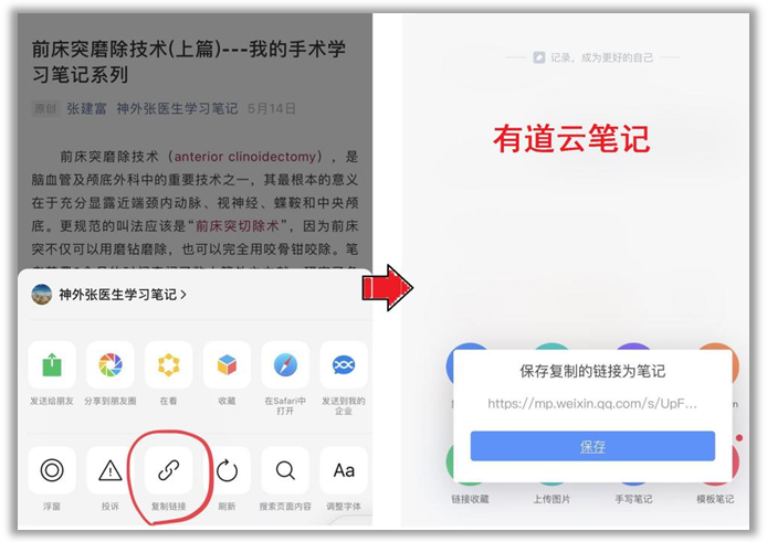 使用方法非常简单:只需要将微信文章“复制链接”,然后打开“有道云笔记”,会自动弹出“保存复制的链接为笔记”,点击保存即可。