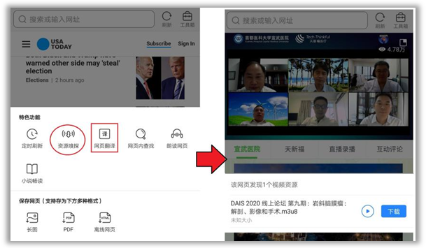 手机QQ浏览器(安卓版)具有资源嗅探功能,不管是微信公众号的直播课程,还是SNI、油管、Vimeo上的手术视频都能轻松搞定。现在网络授课非常普及,推荐各位同仁将感兴趣的视频下载到手机上,不仅可以反复观看,还节省流量,并可防止将来网址失效后视频无法观看。