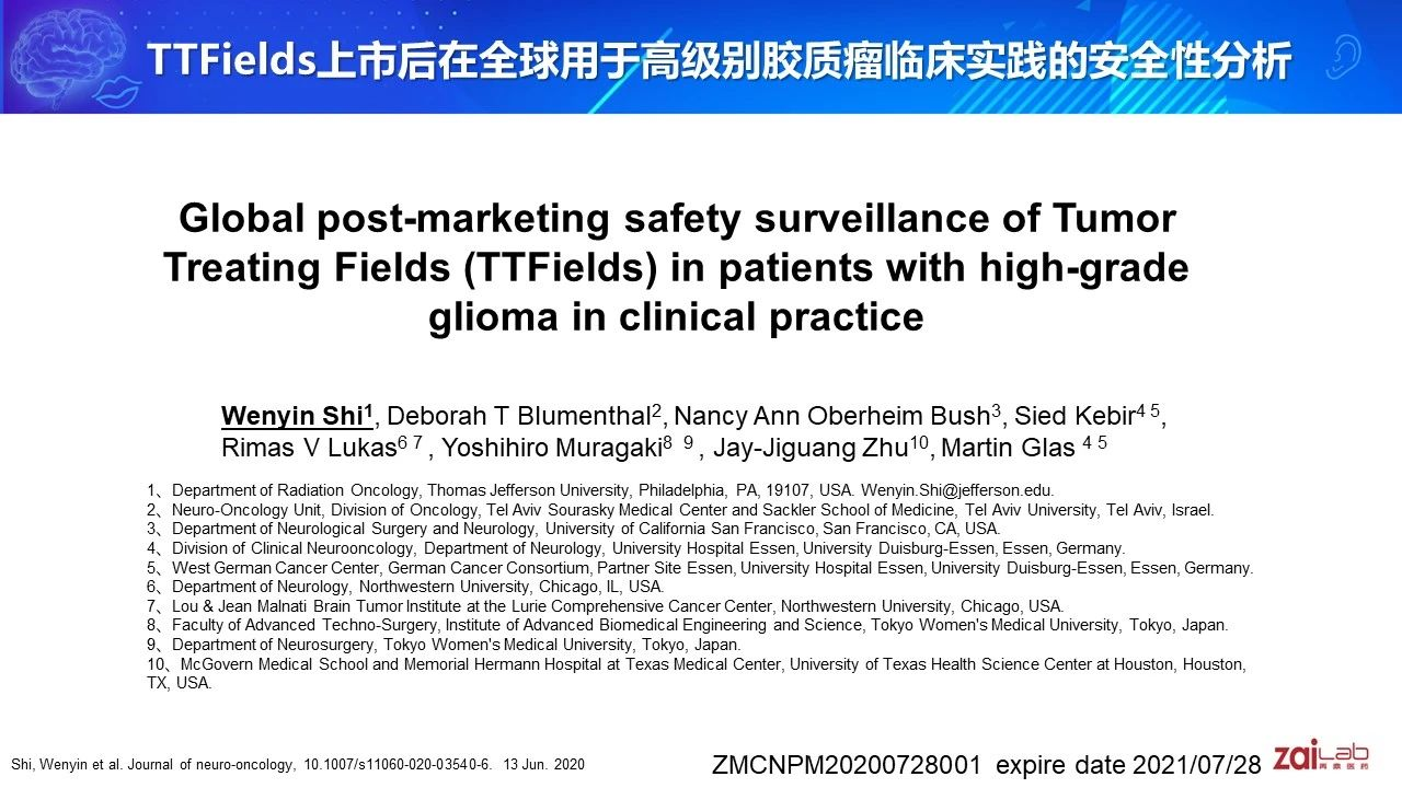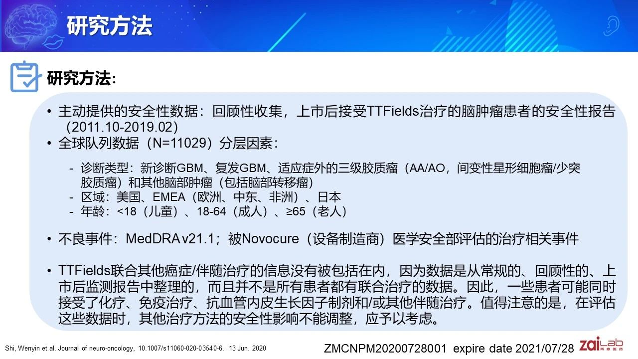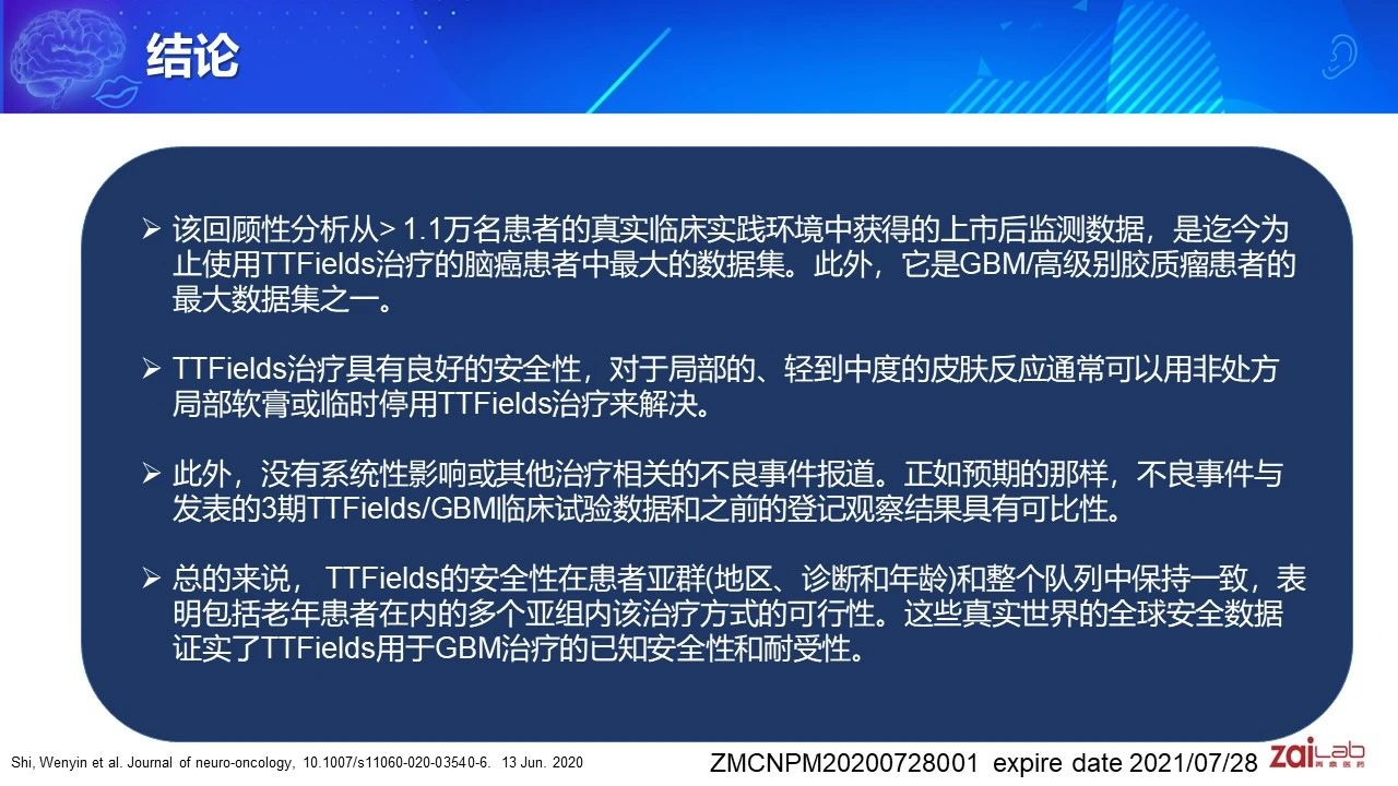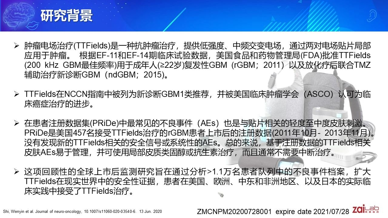肿瘤电场治疗(TTFields)是一种抗肿瘤治疗,提供低强度、中频交变电场,通过两对电场贴片局部应用于肿瘤。根据EF-11和EF-14期临床试验数据, FDA批准TTFields用于成年人(≥22岁)复发性GBM以及放化疗后联合TMZ辅助治疗新诊断GBM。在患者注册数据集(PRiDe)中最常见的不良事件是与贴片相关的轻度至中度皮肤刺激。总的来说,基于注册数据的TTFields相关皮肤AEs易于管理,并可使用局部皮质类固醇或抗生素治疗,而且通常不需要中断治疗。本期说文解惑由山西省人民医院神经外科王春红主任为大家分享一篇TTFields上市后在全球用于高级别胶质瘤临床实践的安全性分析报道,这项回顾性的全球上市后监测研究旨在通过分析>1.1万名患者队列中的不良事件档案,扩大TTFields在现实世界中的安全性证据。