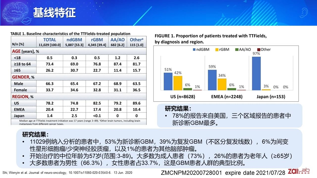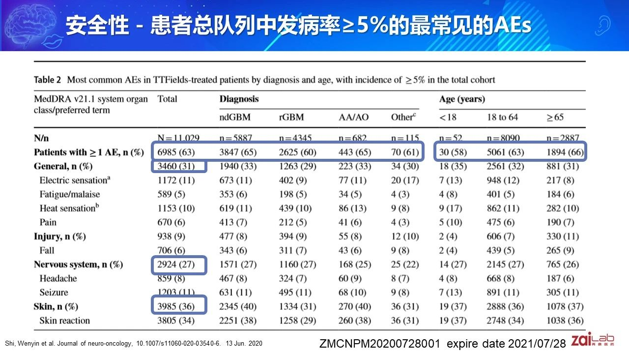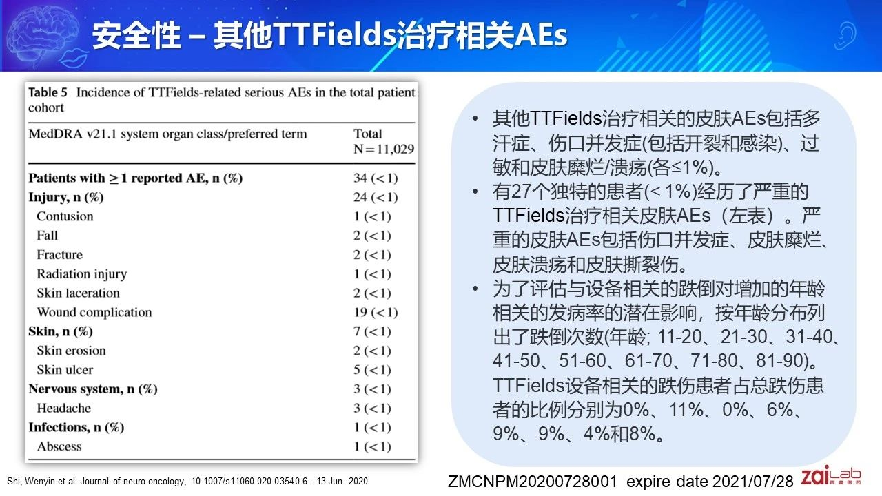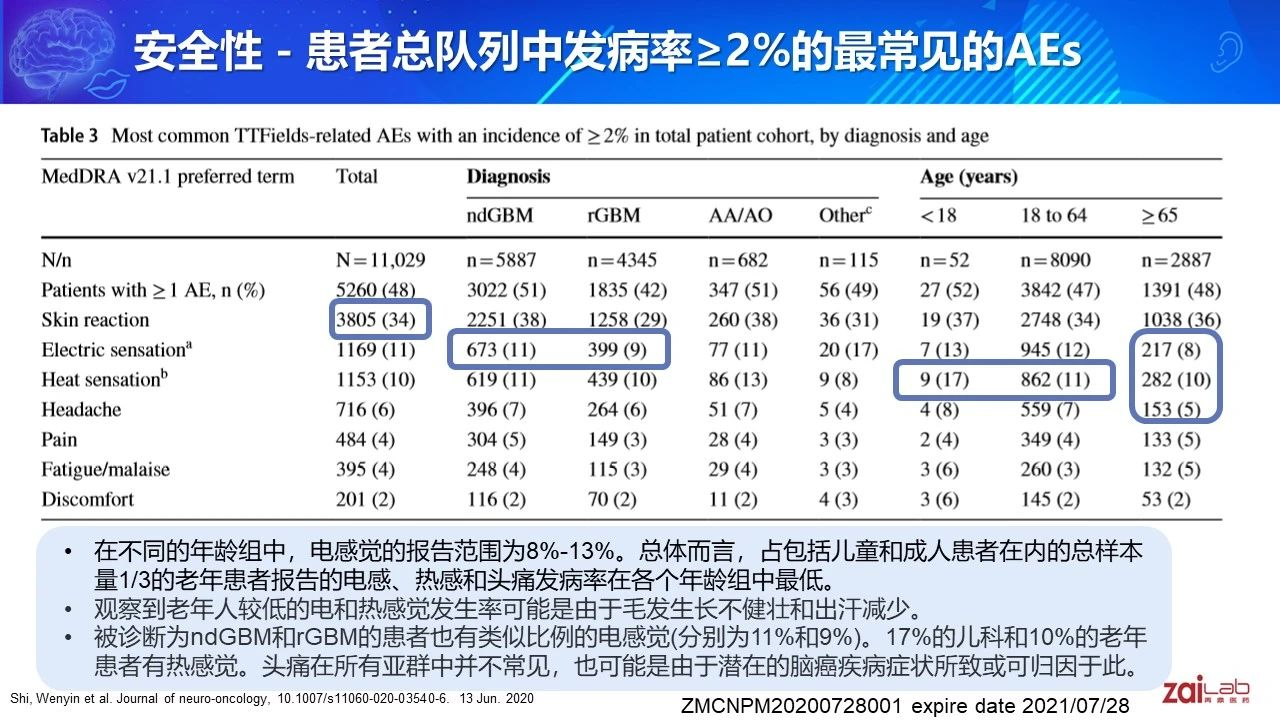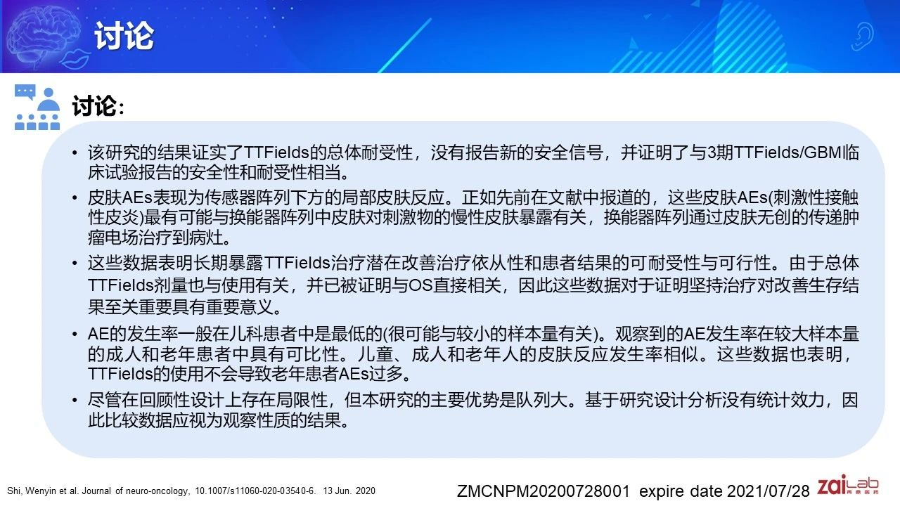 肿瘤电场治疗(TTFields)是一种抗肿瘤治疗,提供低强度、中频交变电场,通过两对电场贴片局部应用于肿瘤。根据EF-11和EF-14期临床试验数据, FDA批准TTFields用于成年人(≥22岁)复发性GBM以及放化疗后联合TMZ辅助治疗新诊断GBM。在患者注册数据集(PRiDe)中最常见的不良事件是与贴片相关的轻度至中度皮肤刺激。总的来说,基于注册数据的TTFields相关皮肤AEs易于管理,并可使用局部皮质类固醇或抗生素治疗,而且通常不需要中断治疗。本期说文解惑由山西省人民医院神经外科王春红主任为大家分享一篇TTFields上市后在全球用于高级别胶质瘤临床实践的安全性分析报道,这项回顾性的全球上市后监测研究旨在通过分析>1.1万名患者队列中的不良事件档案,扩大TTFields在现实世界中的安全性证据。