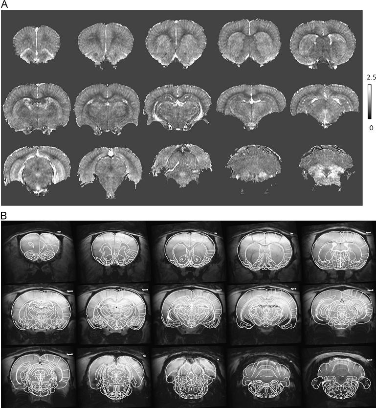 高分辨率CBF MRI显示大鼠脑组织不同区域皮质和皮质下结构的脑血流量存在差别。CBF MRI上皮质内出现纵向柱状的明暗交替带,反映流量减少的小动脉和流量增加的小静脉分布;同时皮质内出现横向层状的明暗交替带,与潜在的血管密度相一致。大鼠脑皮质横剖面的血流量图像上,在Ⅳ层和Ⅴ层出现双峰,在Ⅴ层有一低谷。全脑血流量约为0.89 ml/g/min;脑血流量最大值在新皮质处,为0.89–1.16 ml/g/min,平均 1 ml/g/min;最小值在胼胝体处,为0.32 ml/g/min;灰质血流量是白质的3倍。功能磁共振脑血流量图像的峰值出现在皮质横剖面Ⅳ-Ⅴ层;而血氧水平依赖功能磁共振(BLOD fMRI)脑血流量图像的峰值出现在皮质横剖面浅表的Ⅱ-Ⅲ层。