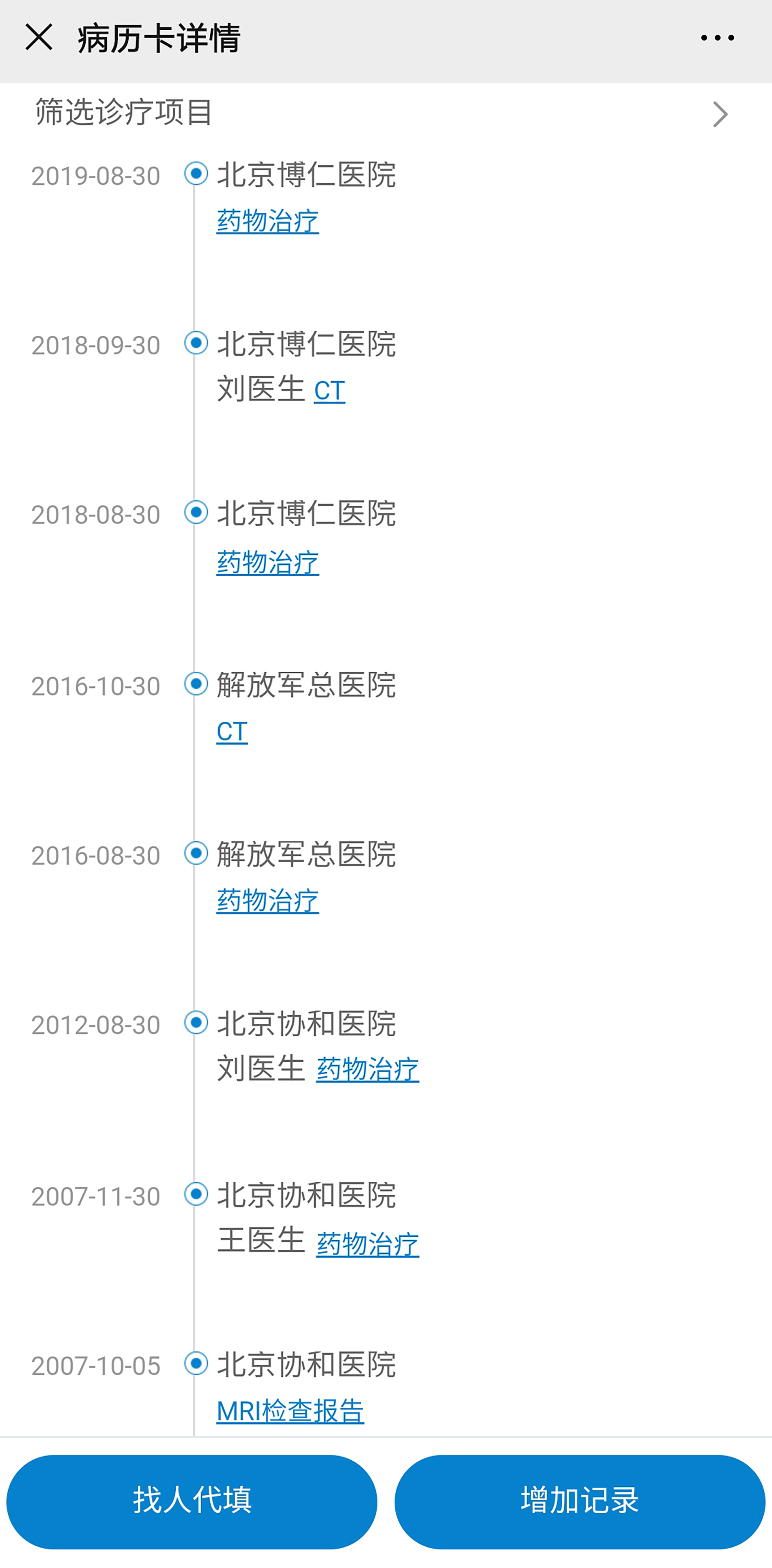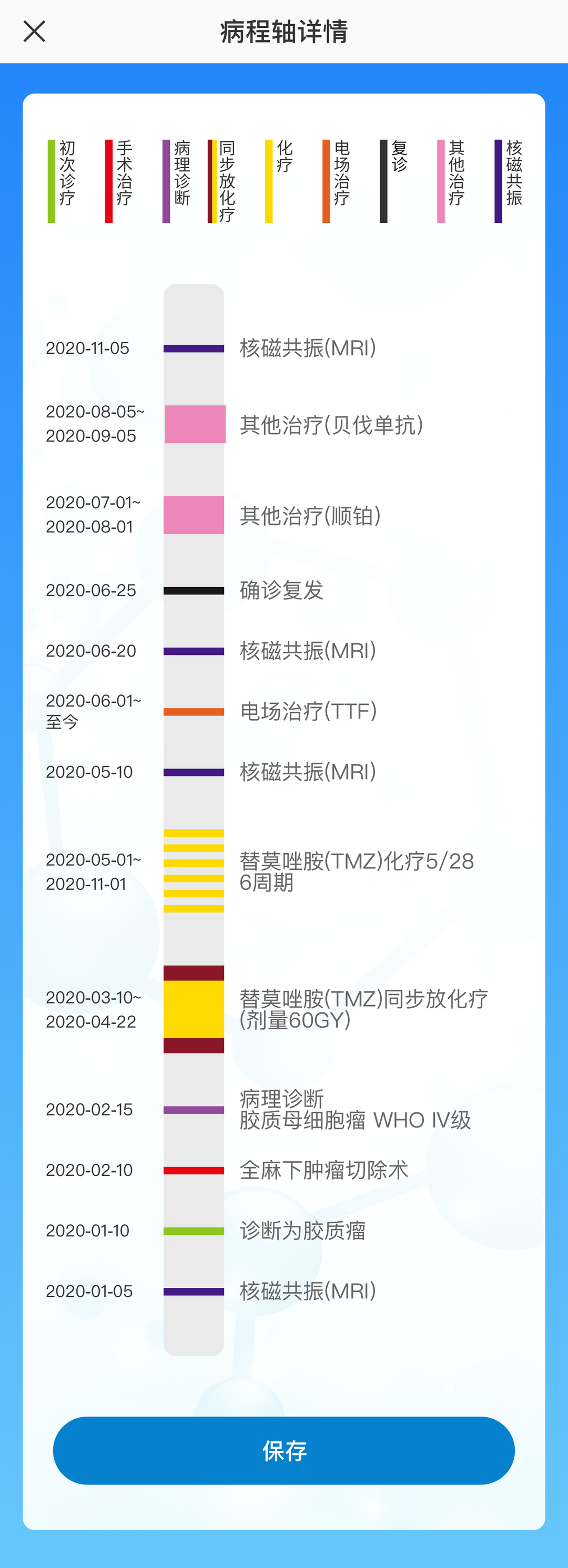 胶质瘤患者病历更可以一键生成病程轴,让患者的关键治疗信息一目了然。