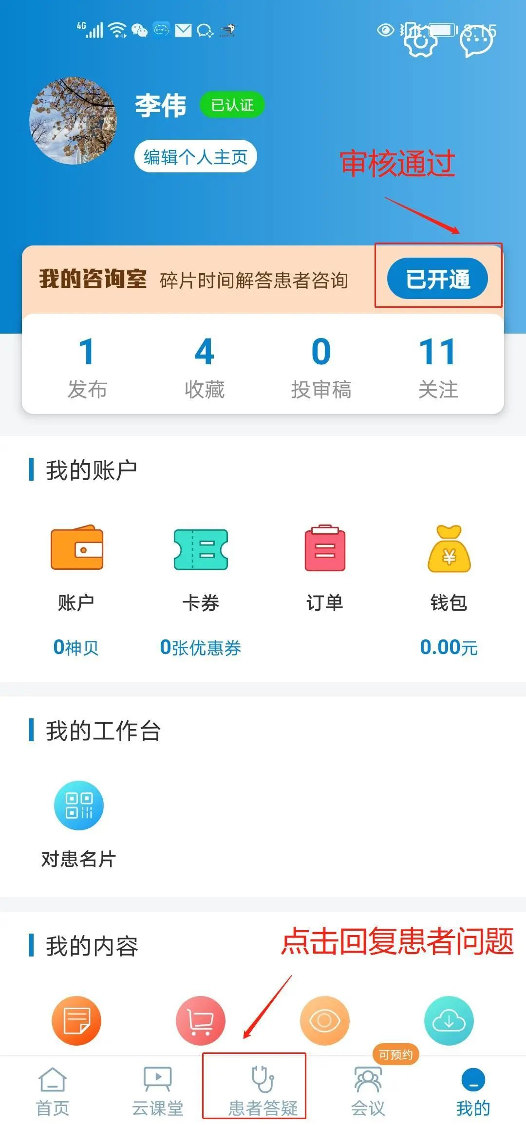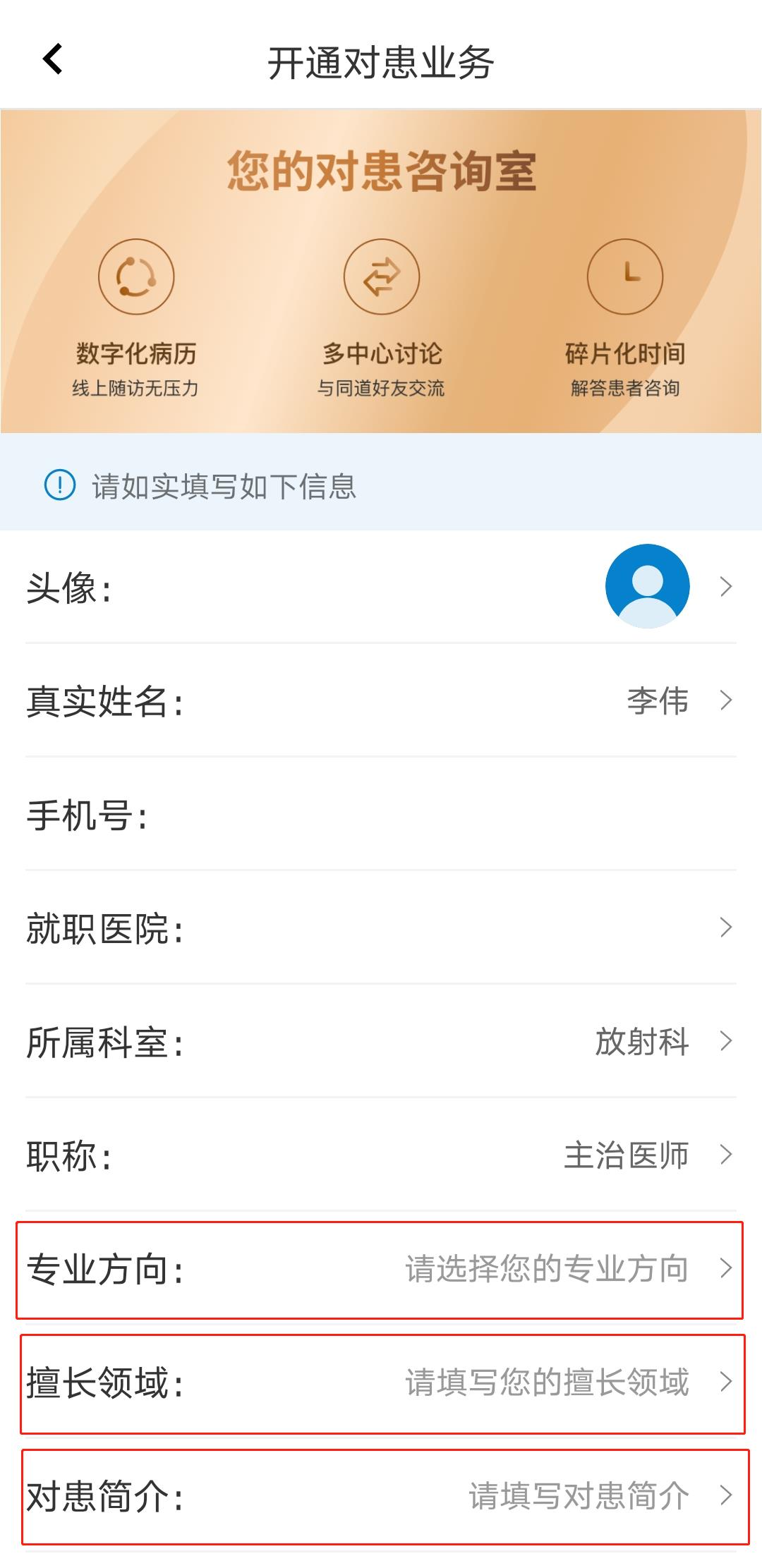 进入【患者答疑版块】,点击“去开通”,开通您的对患业务