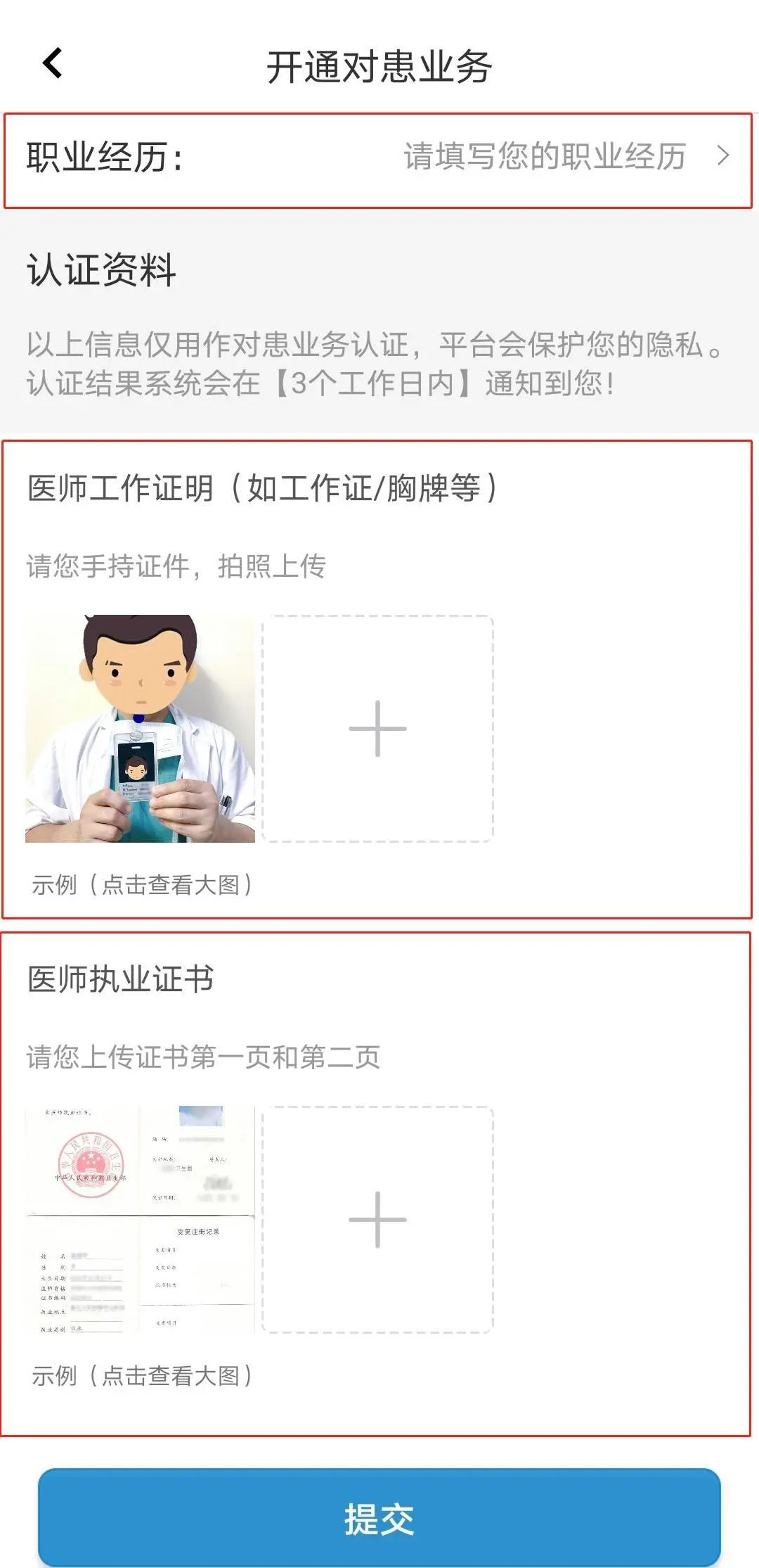 填写您的专业方向,擅长领域,对患简介等相关信息,上传“医师工作证明”及“医师执业证书”,点击提交,工作人员会尽快为您审核。
