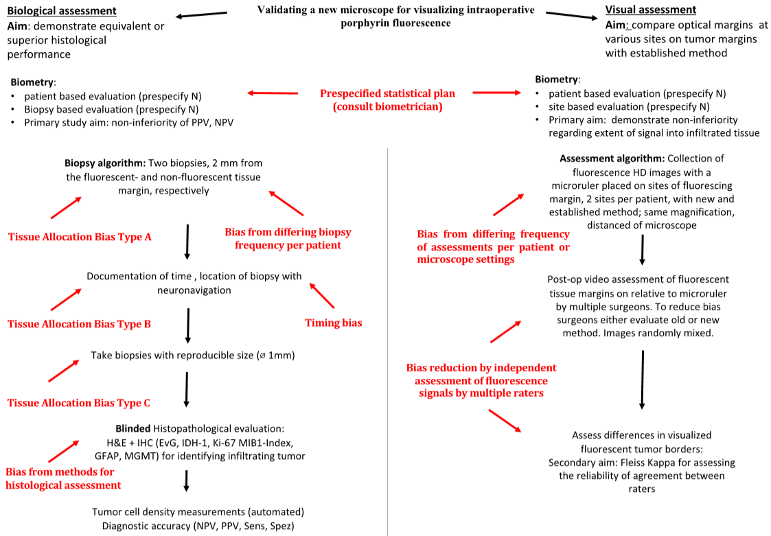 最后提出诊断报告的标准(STARD-CNS),目的是提高研究质量和研究报告的完整性和准确性,使读者了解研究的潜在偏差(内部效用),评估研究结果的概括性和适用性(外部效用)。有关STARD-CNS的内容概况如下:①设计术中神经导航和术后成像方案,以评估荧光检测信号的范围,以及与MRI的关系。②首先根据导航选定活检的组织区域,结合成像数据和荧光检测信号,最后取活检以证实。③应描述纠正脑移位的方法。④进行完整的活检组织评估。⑤通过免疫组化补充HE病理染色检测结果,包含浸润性肿瘤细胞。⑥重点放在PPV和NPV上,PPV是唯一的精确度测量值,而且不需要从正常大脑组织中取样。⑦使用客观的光谱分析验证主观视觉印象。⑧除活检外,考虑其它参考标准,如切除范围和结果(安全性、存活率)。⑨事前确认终点的统计方法,请统计学专家参与计划。⑩如果不能收集到足量的活检样本时,考虑使用适当的统计学方法进行调整。