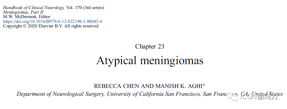 《Handbook of Clinical Neurology》杂志 2020年6月刊载[170:233-244.]美国加州大学旧金山分校的Chen R , 和Aghi MK 撰写的综述《不典型脑膜瘤。Atypical meningiomas.》(doi: 10.1016/B978-0-12-822198-3.00043-4.)。