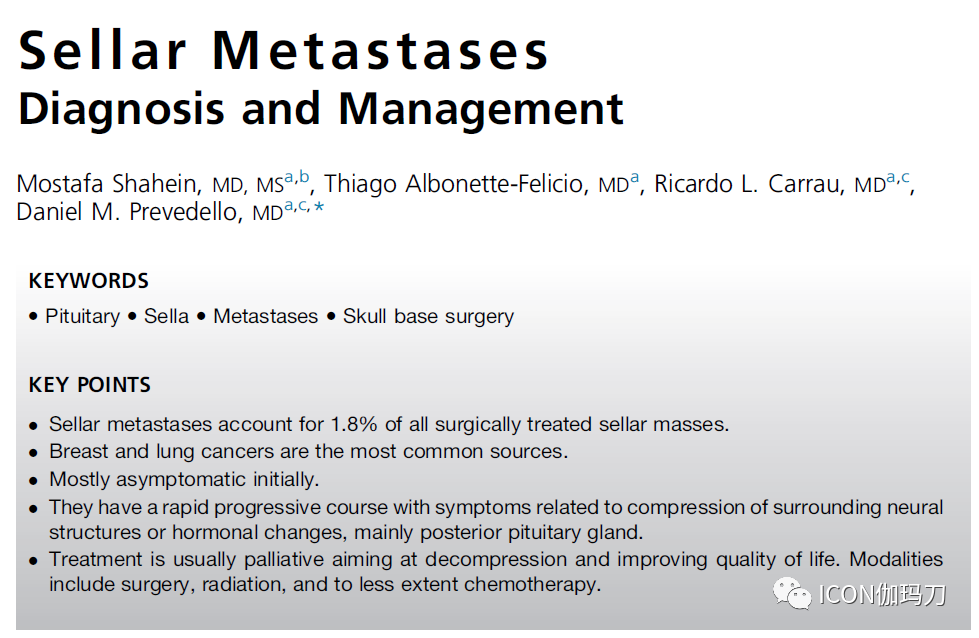 《Neurosurgery Clinics of North America 》杂志 2020 年十月刊载[Oct;31(4):651-658.]美国The Ohio State University Wexner Medical Center的 Mostafa Shahein, Thiago Albonette-Felicio, Ricardo L Carrau, Daniel M Prevedello撰写的综述《鞍区转移瘤:诊断和治疗。Sellar Metastases: Diagnosis and Management》(doi: 10.1016/j.nec.2020.06.012.)。