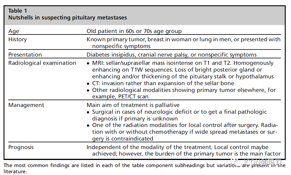 鞍区转移瘤(SM)包括转移到垂体、垂体柄或周围结构的转移瘤(表1)。英语文献中最早报道的病例之一是在1913年;这在此之前在19世纪德语文献中报道过1例垂体转移瘤(PM)。鞍区转移瘤(SM)和垂体转移瘤(PM)在文献中有时可以互换使用。最近的荟萃分析显示,在所有颅内转移瘤中,鞍区转移瘤(SM)占0.87%。他们占所有手术治疗的鞍区肿块的1.8%。年龄在70岁以内的老年患者是最受影响的年龄组;然而,它可能发生在较年轻的患者中。