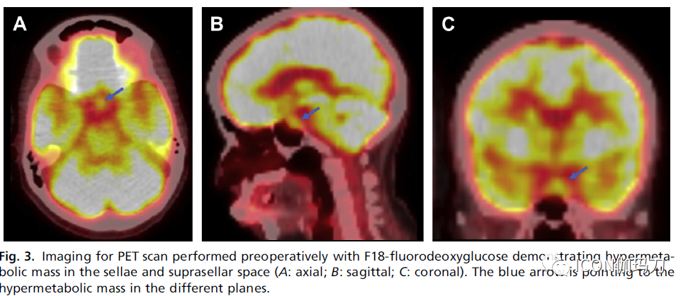 图3.术前用F18 -氟脱氧葡萄糖进行PET扫描,显示鞍区和鞍上间隙有高代谢肿块(A:轴位;B:矢状位;C:冠状位)。蓝色箭头指向不同层面的高代谢肿块。