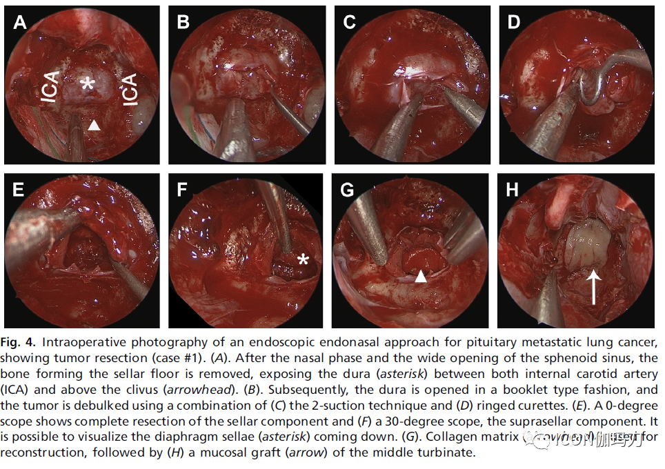 图4.经鼻内窥镜入路垂体转移性肺癌的术中摄影,显示(病例#1)肿瘤切除术。(A).在鼻段和蝶窦敞开后,切除形成鞍底的骨质,显露在颈内动脉(ICA)和斜坡上方(箭头)之间的硬脑膜(箭头)。(B).随后,以小窗的方式打开硬脑膜,并使用(C)双吸头技术和(D)环形刮匙的组合来减瘤。(E). 0度范围显示鞍上部分完整切除,(F) 30度范围显示鞍上部分完整切除。可见鞍膈(星号)下降。(G).胶原蛋白基质(箭头)用于重建,然后使用(H)中鼻甲粘膜移植物(箭头)。