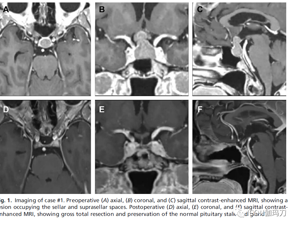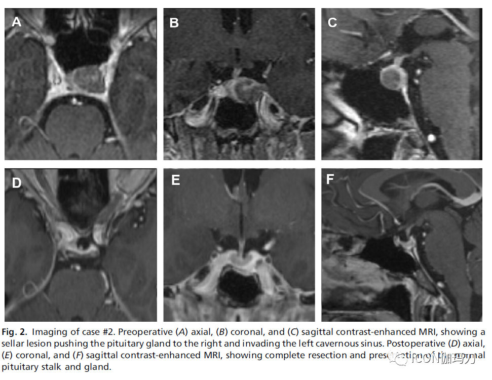 图1.病例#1的影像学检查。术前(A)轴位、(B)冠状位和(C)矢状位对比增强MRI,显示病变占据鞍区和鞍上间隙。术后(D)轴位,(E)冠状位和(F)矢状位MRI对比增强,显示大体全切除并保留正常垂体柄和腺体。