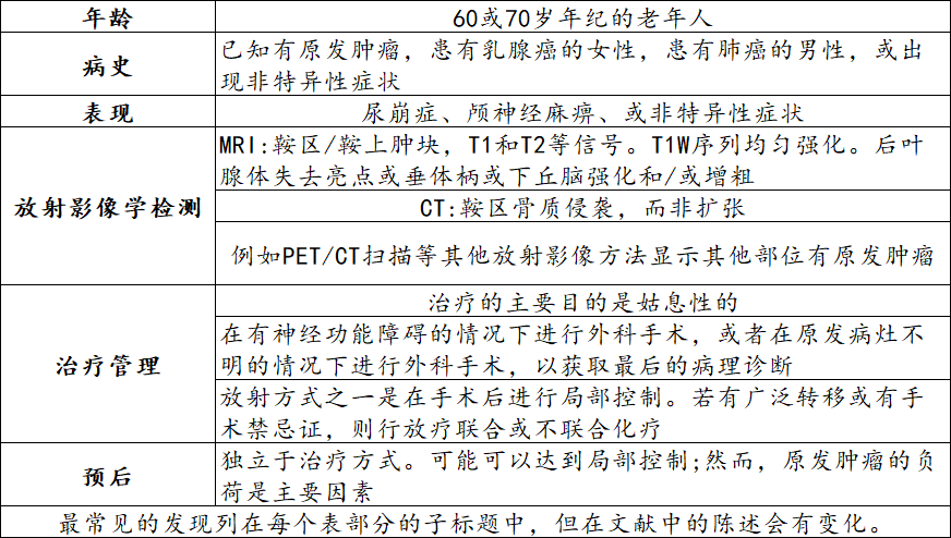 鞍区转移瘤占颅内转移瘤的0.87%。它们通常是无症状的,可能是一些隐匿的恶性肿瘤的最初表现。诊断主要是在对已知原发病变筛查期间或可在患者出现与压迫或侵犯周围结构有关的神经或激素变化时作出的。鉴别这些病变与其他更为常见的如垂体腺瘤等病变可能比较困难。治疗主要针对原发病变,是姑息性的,以提高生活质量或作出病理证实。