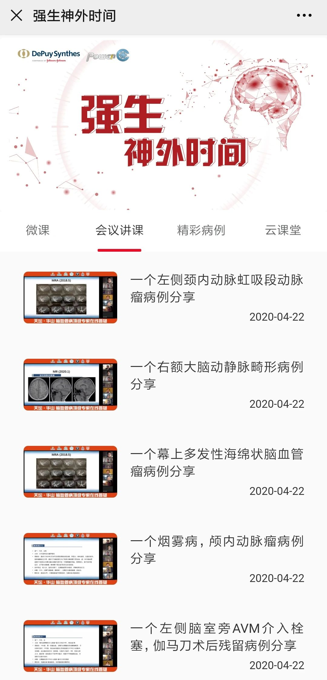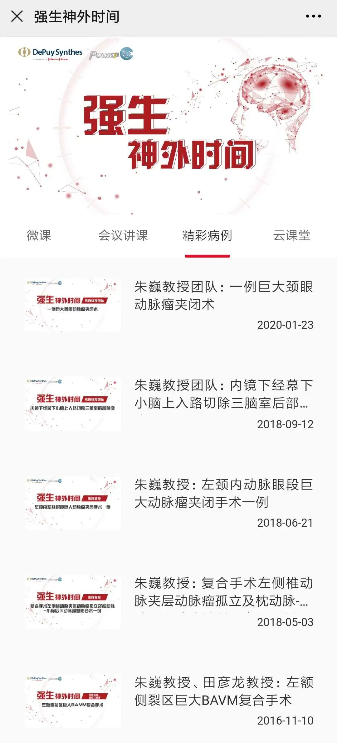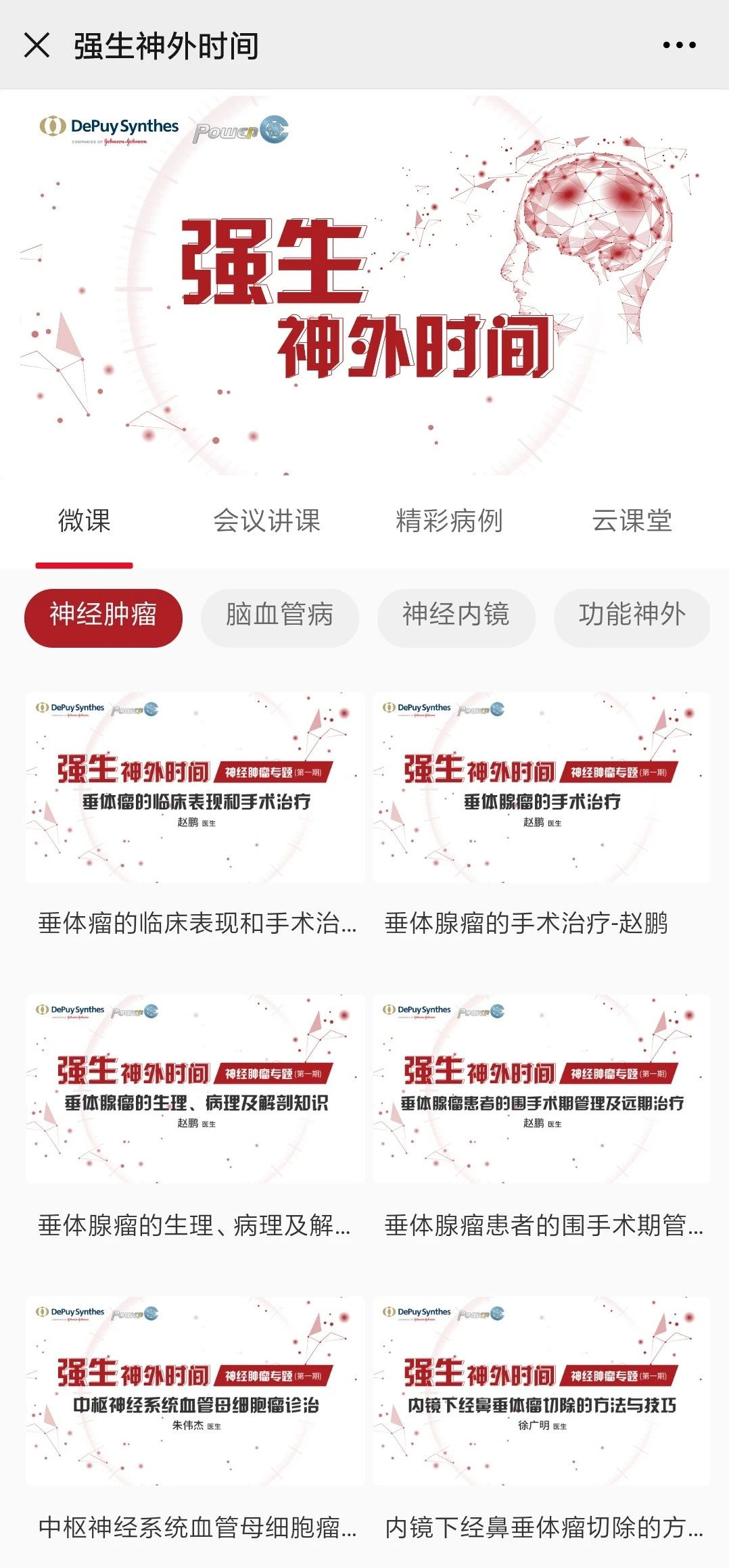 尊敬的各位医师朋友,您好!由强生专业颅骨修复团队与动力工具团队倾情打造的云课堂——强生神外时间,将于2020年9月22日正式上线。在本系列云课堂中,您将接触到来自全国各地的神经外科大咖经典教学,覆盖神经肿瘤、脑血管病、神经内镜、功能神外、脊髓脊柱等多个热点专题。内容将会以在线直播,视频回放,在线互动等形式直观展现。神经外科被誉为“外科皇冠上的一颗明珠”,在毫厘之间,用一把手术刀,与威胁患者生命的死神交锋。本系列课程内容,记录并展现交锋瞬间与经验心得,希望能对大家有所启发。神外循道,强颅济世,聚菁汇神,精益求精!现诚邀您的关注和指导,非常感谢!专栏部分内容一览▼上下滑动查看更多END声明:脑医汇旗下神外资讯、神介资讯、脑医咨询所发表内容之知识产权为脑医汇及主办方、原作者等相关权利人所有。未经许可,禁止进行转载、摘编、复制、裁切、录制等。经许可授权使用,亦须注明来源。欢迎转发、分享。