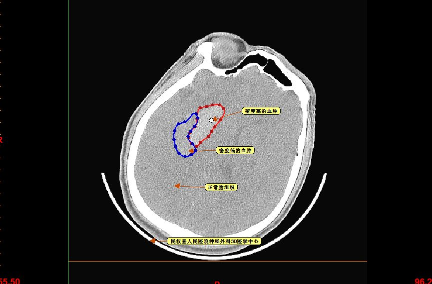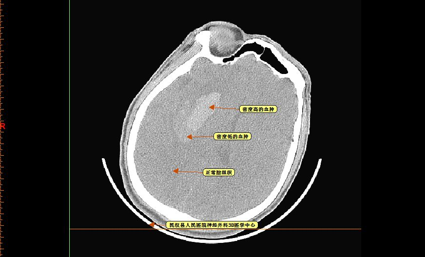 再仔细观察并划定血肿分层区域,可设定血肿为高密度区域、低密度区域,和正常脑组织对比