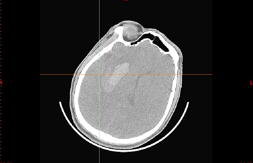 我们再来看另一例脑出血,也是可能与酒精、口服抗凝药物有关。