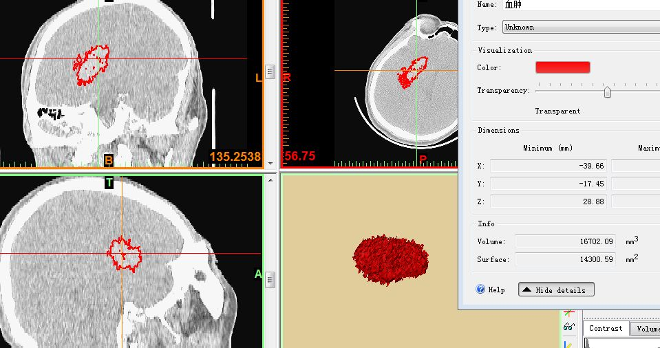 应用3D重建,CT域值设定在55-100,重建血肿量为16.7ml。