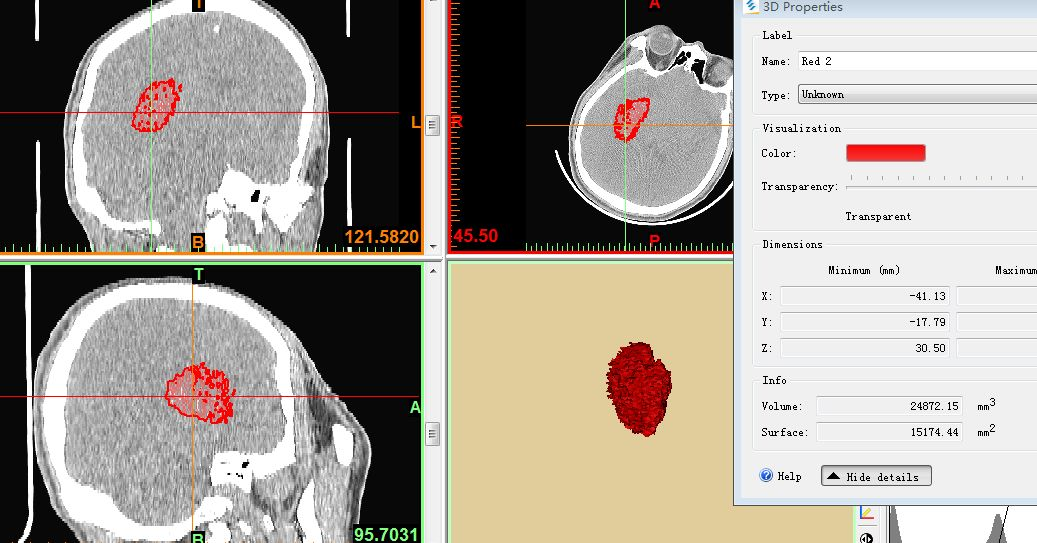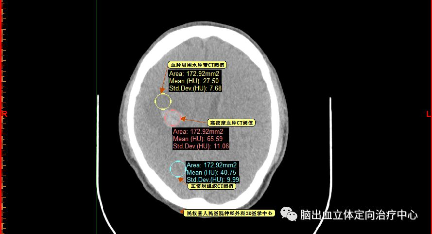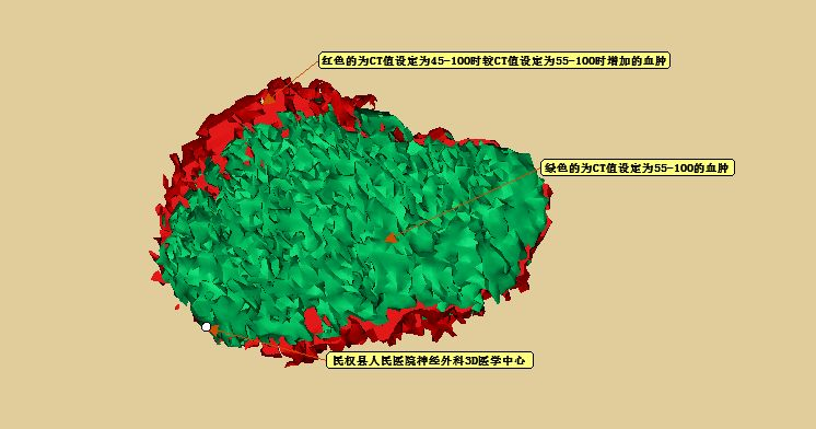 把CT阈值设定为44--100重建血肿量为24.87ml(此血肿量包括分层的高密度血肿及低密度血肿)。