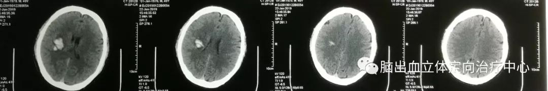 在3D打印导板下成功穿刺血肿,有约16ml暗褐色不凝血肿液引出,术后应用尿激酶一次,CT复查: