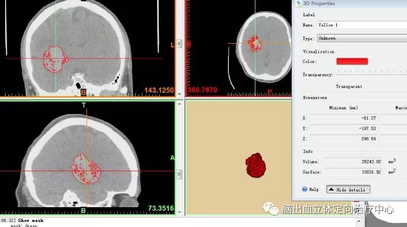 利用3D技术模拟设计穿刺血肿,重建血肿体积约26ml