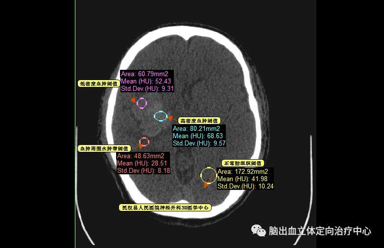 可见血肿呈分层现象,血肿周围水肿带明显,利用3D测量其各相关CT阈值。