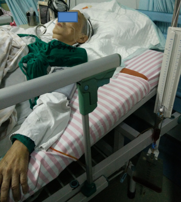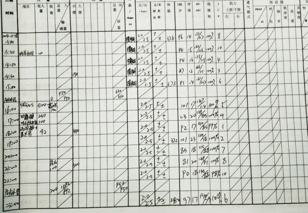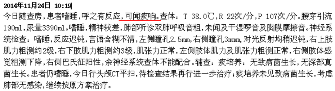 神经系统检查:神清清醒,有遵嘱动作,反应稍迟钝,左侧瞳孔2.5mm,右侧瞳孔3mmm,对光反射均稍迟钝,右上肢肌力粗测约2级,右下肢肌力粗测约3级,肌张力正常,左侧肢体肌力及肌张力粗测正常,右侧巴氏征阳性,余神经系统查体不能配合。