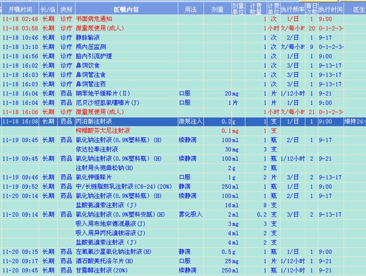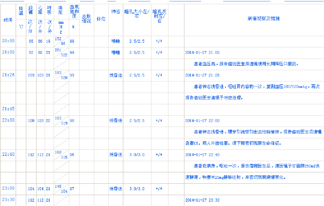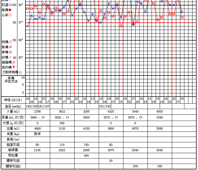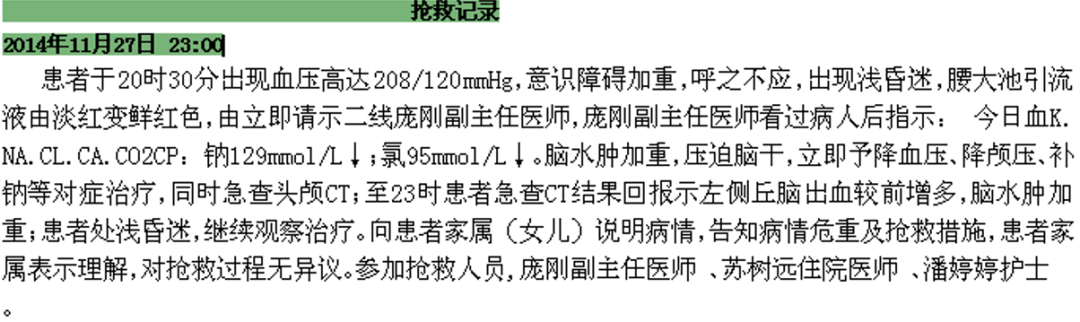 腰大池引流白天50ml,降低引流管高度,在半个小时左右突然100多ml,颜色由淡红转为鲜红色,继而意识障碍加重有昏睡转为浅昏迷,收缩压升高到200mmHg。