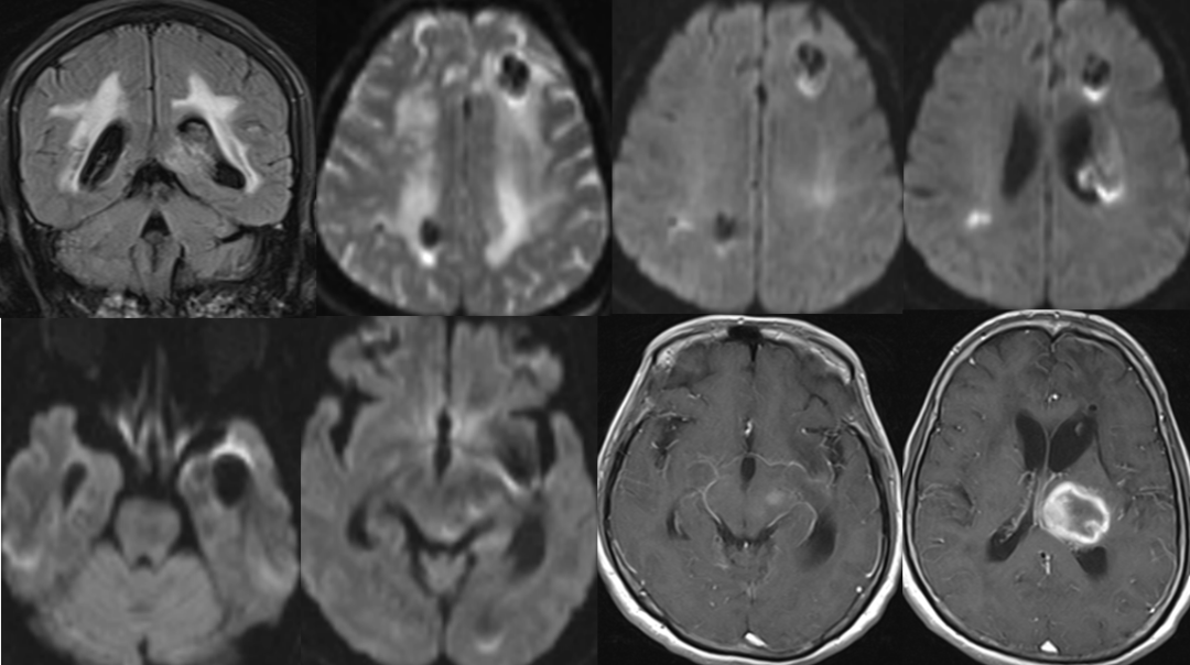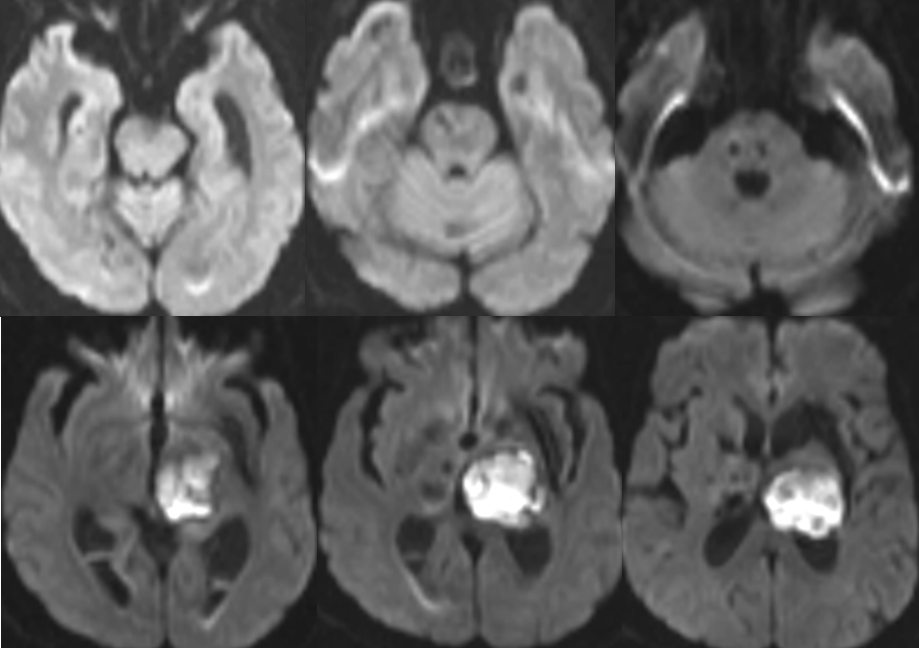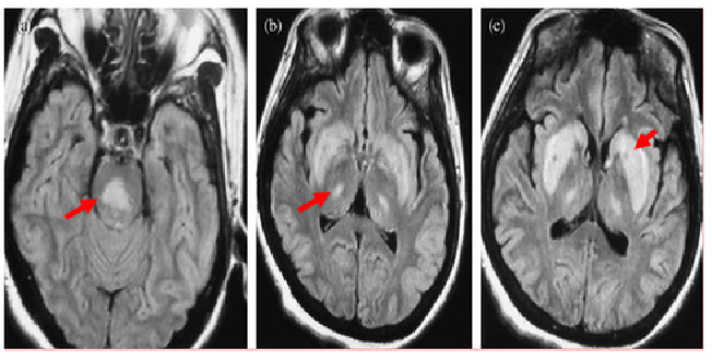 MRI能更好地反映病灶的数量和程度。早期可无异常,出现症状后1周DWI上可发现高信号。急性期表现为对称的T1WI低信号,亚急性期可能是由于内皮细胞受损所致的微出血而显示T2WI高信号。FLAIR显示病灶高信号更清楚,能更好地显示临近脑脊液的病灶,比如大脑皮质,应作为常规检查。也有一些报道发现皮质层及皮质下T1高信号,有的钆增强被强化,有的不被强化。脑MRI对本病具有十分重要的诊断意义,大约在发病2~3周时异常信号最为明显,所以结合病史及临床表现如果考虑ODS的诊断,在MRI检查正常的情况下,在出现症状后10~14天复查MRI是十分重要和必要的。