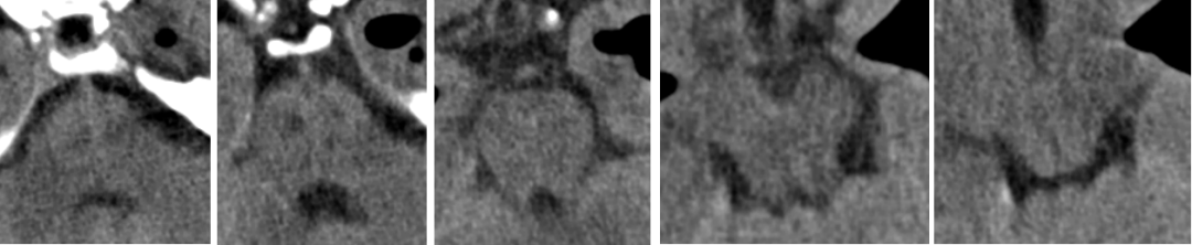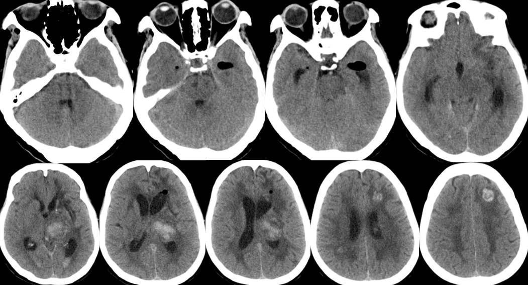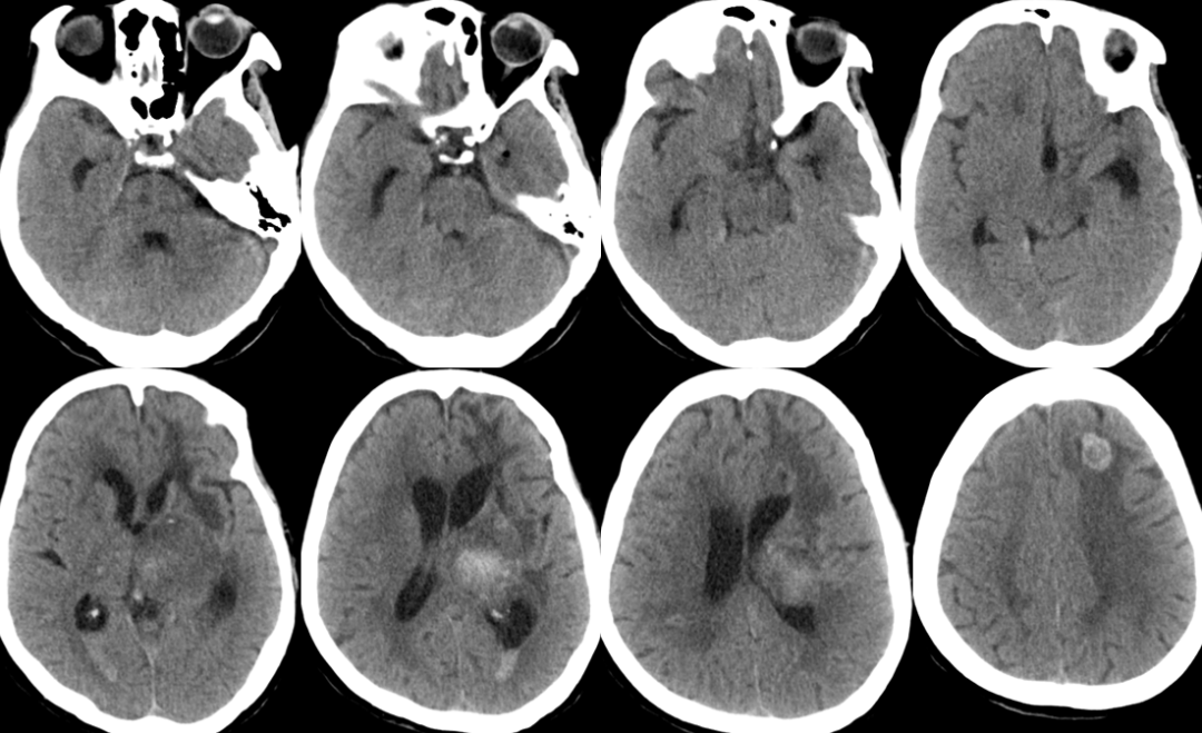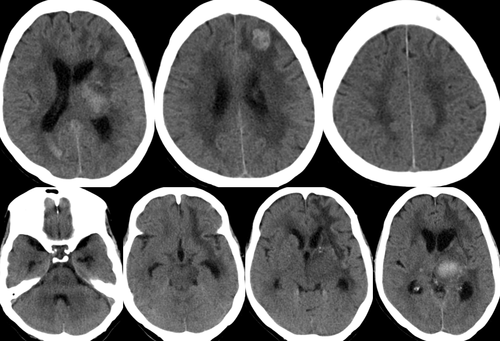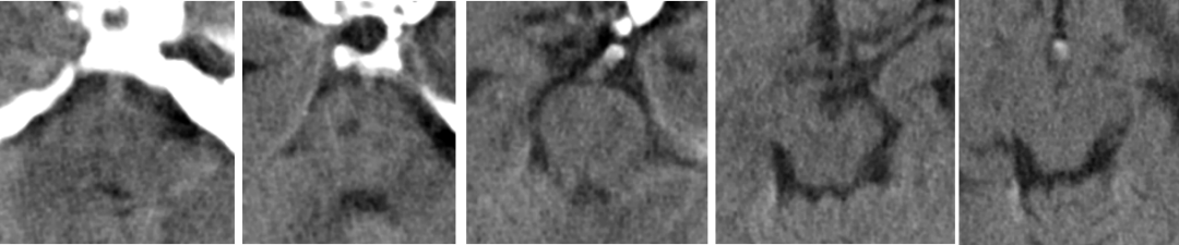 CT表现为脑桥中央或脑桥外病灶处的低密度影。