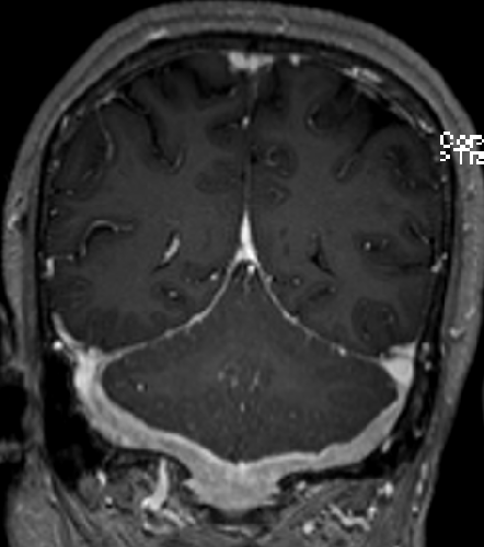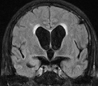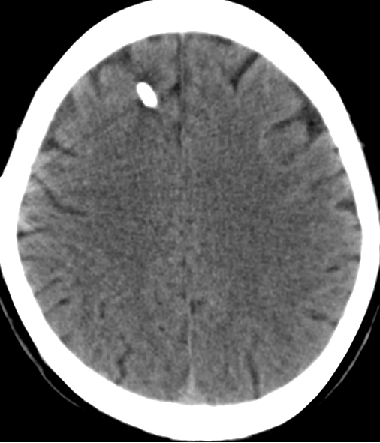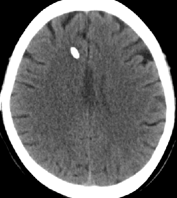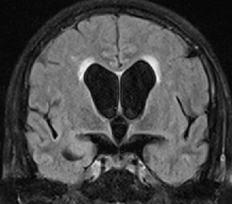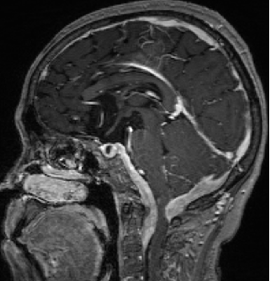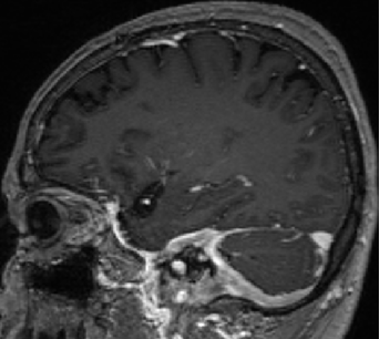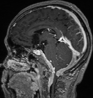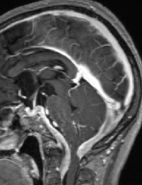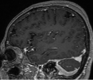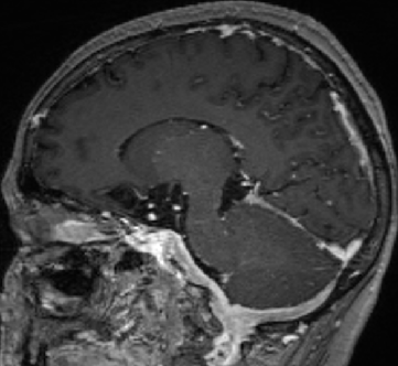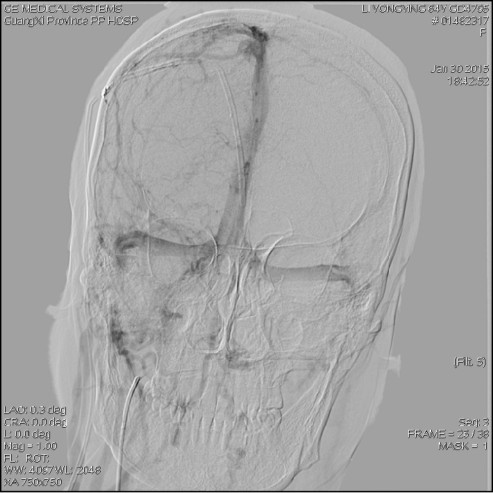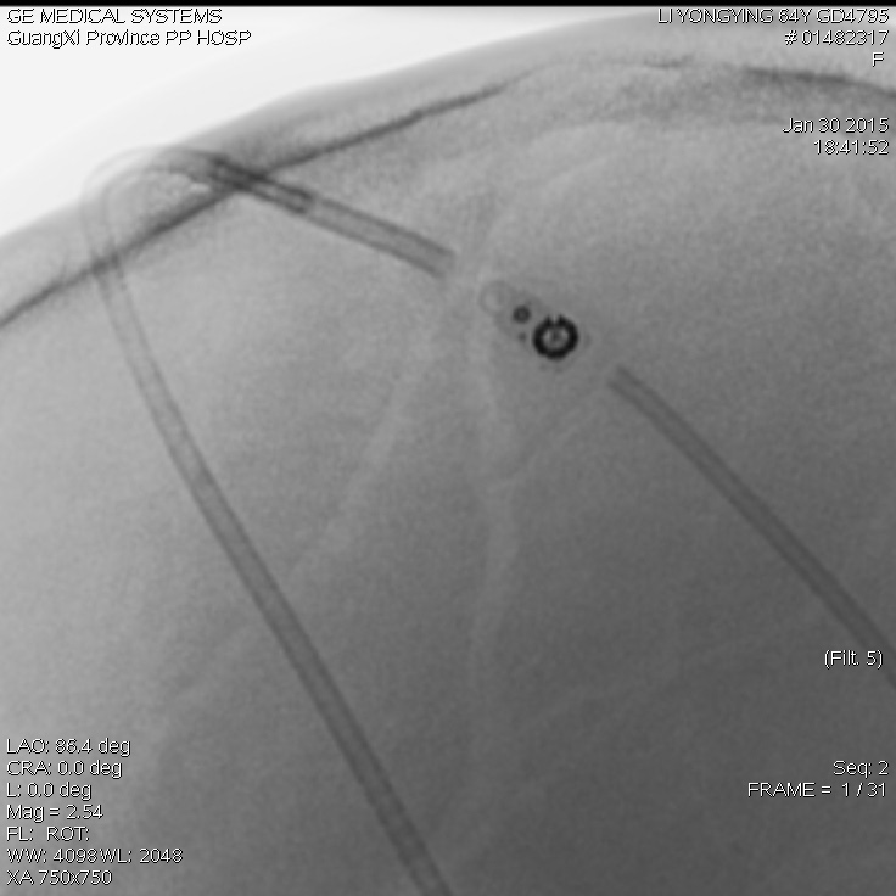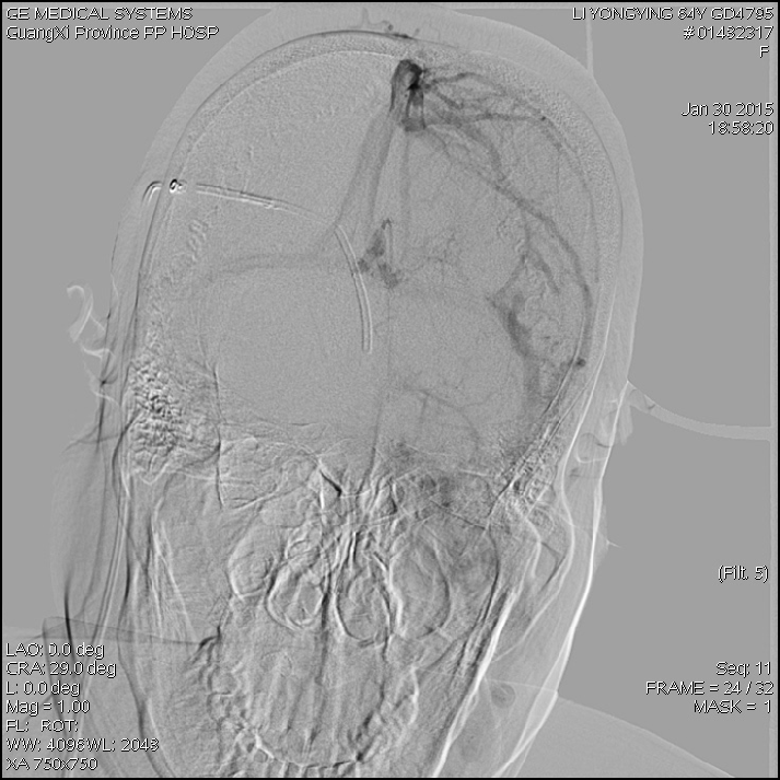 在局麻下行腰椎穿刺术+ 测脑压术,患者取左侧卧位,测量脑脊液压力为60mm水柱。