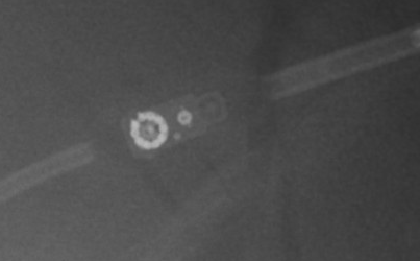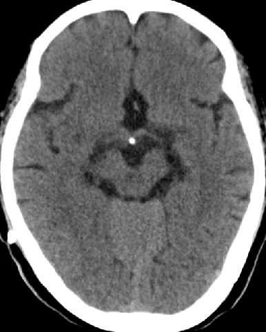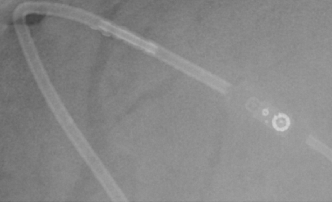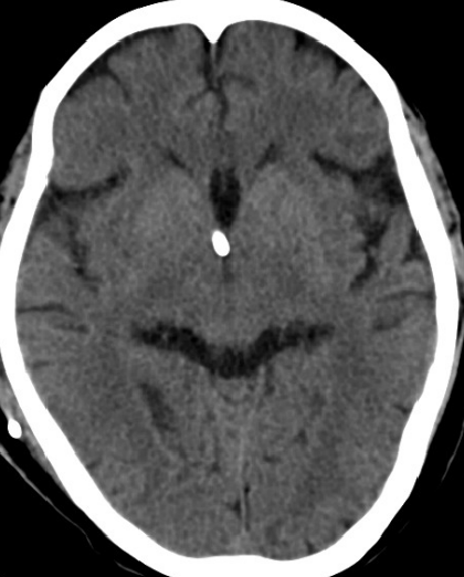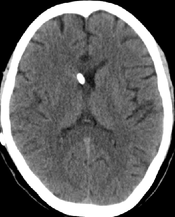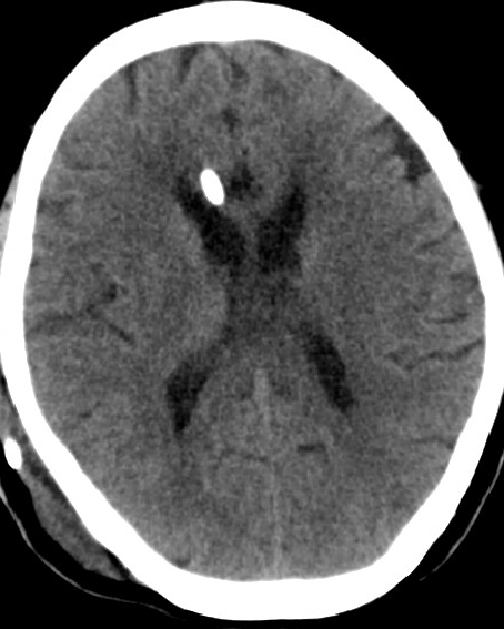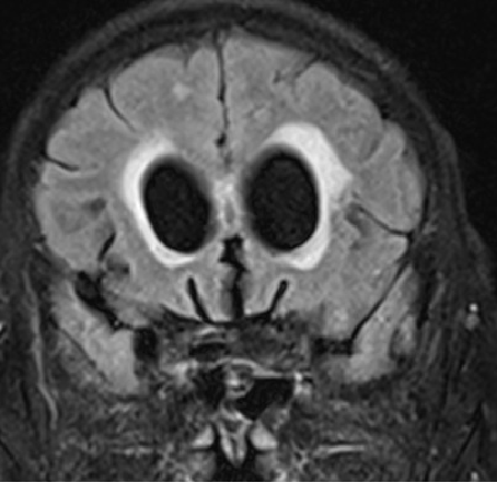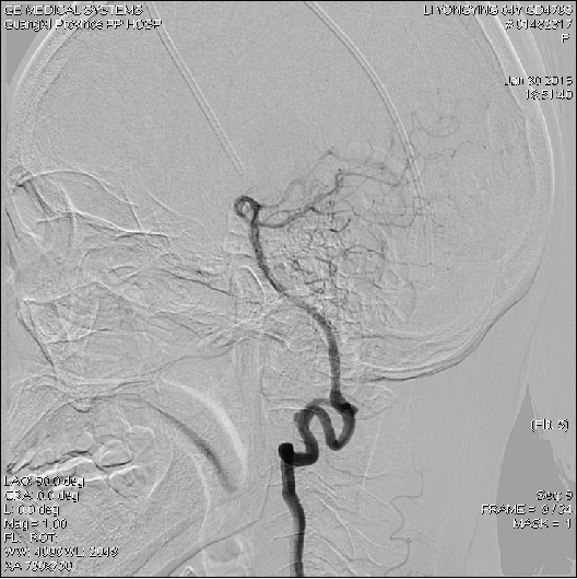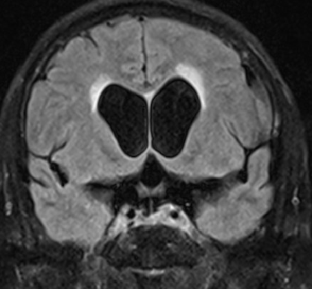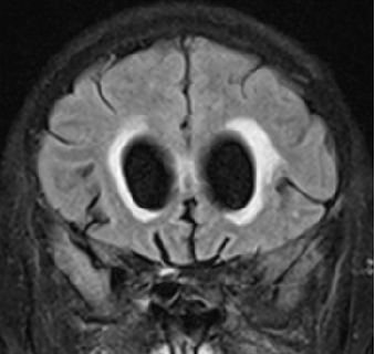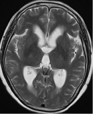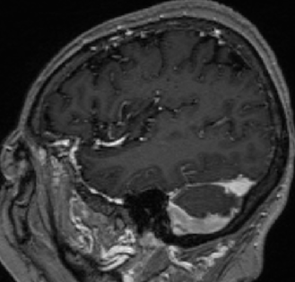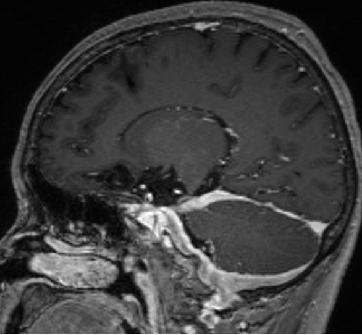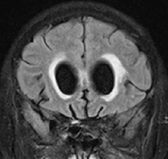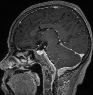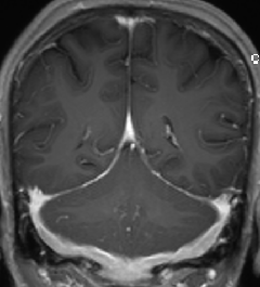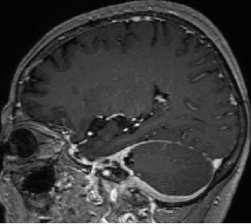 在局麻下行腰椎穿刺术+ 测脑压术,患者取左侧卧位,测量脑脊液压力为60mm水柱。