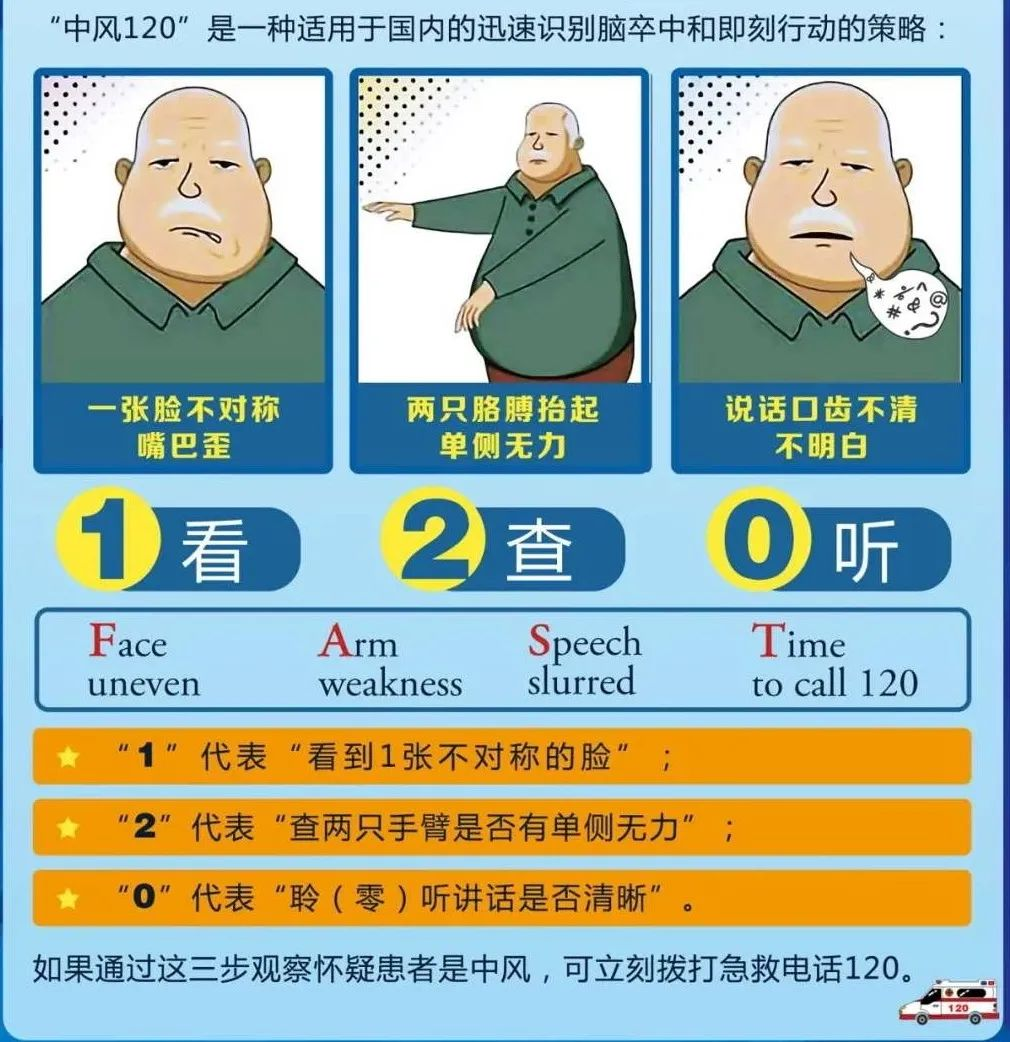 “中风120”是一种适用于国内的迅速识别脑卒中和即刻行动的策略: