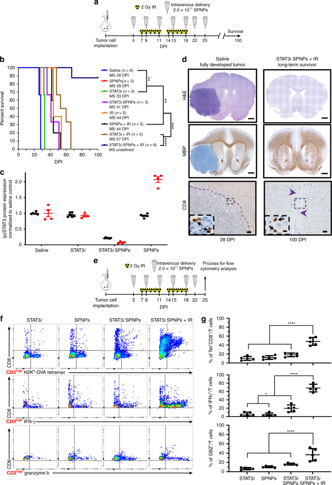 摘 要新型纳米载药颗粒联合放疗,通过增强参与抗原提呈的MHCⅡ的表达来诱导树突状细胞(DC)的激活,诱导免疫反应杀灭肿瘤。经过这一治疗,荷瘤小鼠的肿瘤完全消失,获得长期生存。即使二次植入肿瘤后不施加任何其他治疗,小鼠仍能长期生存。这是第一项证明全身或静脉内输送治疗药物也可以穿越血脑屏障到达脑肿瘤的研究,这为临床治疗胶质瘤带来了新的希望。研究背景血脑屏障(BBB)是指在中枢神经系统内,毛细血管的管壁与胶质细胞形成的血浆与脑细胞之间的屏障,这一屏障仅能允许特定类型的分子从外周血液进入中枢神经系统。由于血脑屏障的存在,有害物质就无法从外周血液进入大脑内,这是人类在自然进化过程中,形成的重要的自我保护的结构。然而,血脑屏障同时也阻止了大多数药物向脑内的转运,严重限制了中枢神经系统疾病(例如阿尔茨海默症、胶质瘤,中枢神经系统感染和卒中等)的治疗发展。因此,如何将药物顺利送达作用区域,是全世界科学家研究的热点。胶质母细胞瘤(Glioblastoma),是最常见、最致命和最难以治疗的成人脑肿瘤(之一)。目前标准的治疗方案是通过手术切除,辅以术后同步放射治疗和替莫唑胺化疗,但该方案疗效有限。胶质母细胞瘤患者的中位生存期仅为16-19个月。近来,来自美国密歇根大学的研究者开发了一种能够穿过血脑屏障的纳米颗粒,将基因治疗药物定向转运至肿瘤内,获得了较好的研究结果,文章《Systemic brain tumor delivery of synthetic protein nanoparticles for glioblastoma therapy》发表在Nature 子刊 Nature Communications 杂志上。研究结果一、设计构建新型纳米颗粒该新型纳米颗粒是基于具有细胞穿透肽iRGD的聚合人血清白蛋白(HSA)的新型合成蛋白纳米颗粒(SPNP),小鼠实验结果表明,合成蛋白纳米颗粒(SPNP)携带STAT3i,通过静脉注射后,成功透过血脑屏障到达肿瘤。二、小鼠体内生存分析基于这一成功构建的工具,研究者进行了体内生存研究:在小鼠颅内注射GBM肿瘤细胞,形成肿瘤后,小鼠在三周的时间里接受了7剂STAT3i SPNPs治疗(见图a)。在治疗的前两周中的每一周,小鼠还每天接受5次2 Gy的放疗(2周共10次)。实验组包括接受STAT3i SPNPs、空白SPNPs、游离STAT3i或生理盐水加或不加联合放疗的小鼠。在所有病例中,放疗增加了中位生存期,单独放疗导致中位生存期从肿瘤植入后28天延长到44天。加上空SPNPs不会进一步延长生存期。游离siRNA提供了轻微的、仅有统计学上显著的好处,当与放疗结合时,中位生存期延长到肿瘤植入后58天(下图b,棕色线)。作者认为:静脉注射全身给游离siRNA效果有限的原因药物无法穿越有效血脑屏障。注射STAT3i SPNPs与放疗的结合效果最显著。在这组中的8只小鼠中,有7只达到了肿瘤植入后90天的标准长期生存时间点,此后似乎完全没有肿瘤(下图b,蓝色线)。接受这种治疗但没有达到长期存活的唯一1只小鼠在肿瘤植入后67天死亡,比所有其他组的任何其他受试小鼠都活得更长。研究者进一步阐明了STAT3及其活性磷酸化形式pSTAT3在脑组织中的表达(图c)。正如预期的那样,在STAT3i SPNP组中,STAT3蛋白的总形式和磷酸化形式均显著降低。与生理盐水对照组相比, GBM荷瘤小鼠的总STAT3蛋白降低了50%以上,pSTAT3水平降低了10倍以上。而游离STAT3i组和空SPNP组的总STAT3水平相对没有变化。用免疫组织化学(IHC)分析长期存活者和其他治疗组的大脑。图d显示了长期幸存者和未接受治疗的对照动物的大脑的直接比较。结果清楚地显示:对照组小鼠的单侧大脑半球内存在完全发育的肿瘤。相反,接受STAT3i SPNP +放疗的小鼠没有颅内肿瘤的证据(图3d,顶部)。此外,在接受全程治疗后的90天中,这些动物的大脑没有明显的坏死、栅栏或出血区域。髓鞘碱性蛋白(MBP)染色评估髓鞘的完整性,髓鞘是周围脑结构破坏的指标。在接受联合STAT3i SPNP + 放疗的小鼠中,与盐水处理对照组中无癌小鼠的右侧半球相比,髓鞘形态没有明显的变化(图D,中)。此外,TME中CD8 T细胞稀疏(图D,下图),表明该治疗没有诱发显著炎症反应,没有显著的毒性。进一步研究发现:STAT3i SPNPs联合放疗通过增强参与抗原提呈的MHCⅡ的表达来诱导树突状细胞(DC)的激活,诱导免疫反应杀灭肿瘤。三、肿瘤复发实验为了模拟肿瘤复发的状态,研究者再次将肿瘤植入通过STAT3i SPNP +放疗治愈的小鼠的对侧大脑半球,这些小鼠没有接受任何额外的干预治疗。作为对照,正常小鼠也在同一时间点植入肿瘤,同样不接受治疗。正如预期的那样,对照组肿瘤生长迅速,疾病迹象增加,中位生存期是27天。然而,尽管没有接受任何额外的治疗,所有模拟肿瘤复发的小鼠都存活到了第二个长期存活点90天(相当于第一次肿瘤植入后180天)。结论这是第一项证明全身或静脉内输送治疗药物也可以穿越血脑屏障到达脑肿瘤的研究。这一发现有望带来治疗胶质母细胞瘤的新临床疗法,为那些原本“不可治疗疾病”带来新的希望。声明:脑医汇旗下神外资讯、神介资讯、脑医咨询所发表内容之知识产权为脑医汇及主办方、原作者等相关权利人所有。未经许可,禁止进行转载、摘编、复制、裁切、录制等。经许可授权使用,亦须注明来源。欢迎转发、分享。