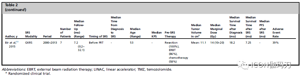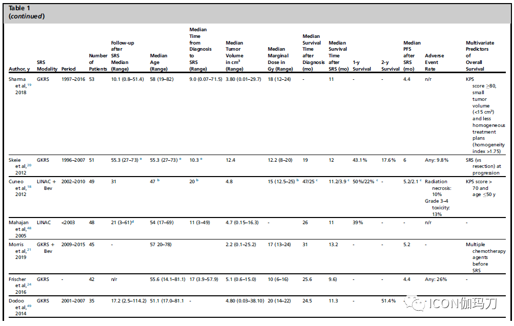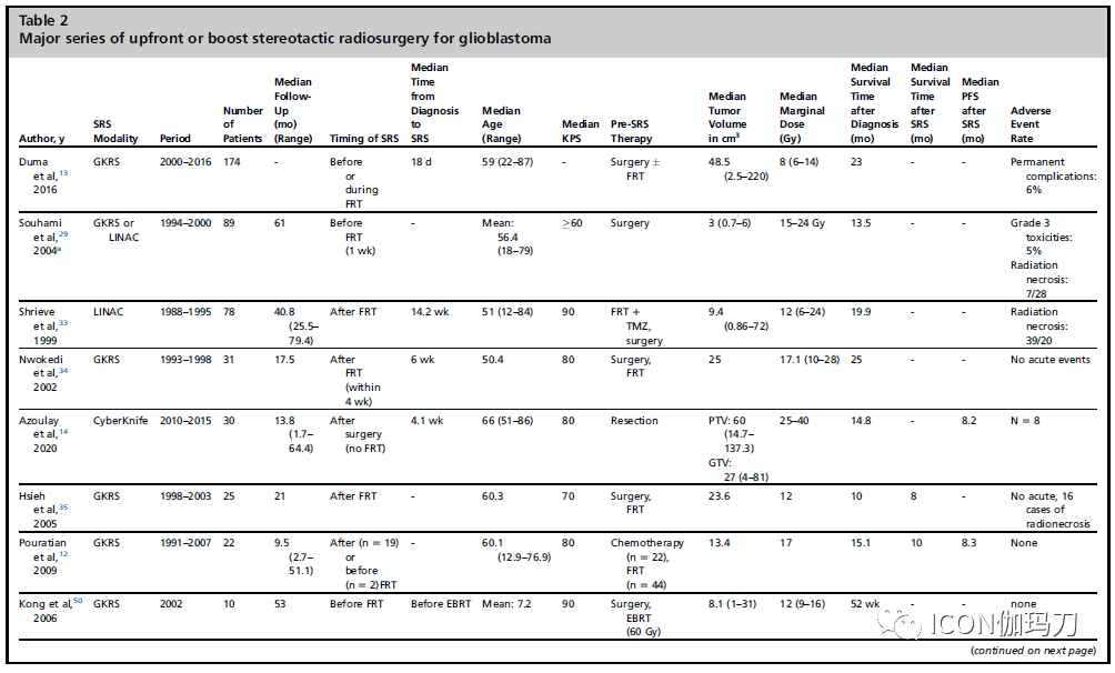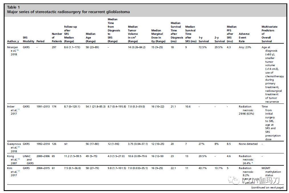 SRS最常用于局部复发GBM与历史上的控制率相比(表1),显示与GBM患者较长的生存期相关。对SRS治疗的GBM 患者的生存的独立的预测因素是较年轻的年龄,肿瘤体积较小,SRS之前使用多个化疗药物,SRS处方剂量,不均质性治疗计划,从手术到SRS的时间和MGMT甲基化状态。报道的接受SRS治疗的中位GBM体积在3.75cm3到14cm3之间最常用的中位处方剂量为16 Gy。SRS治疗GBM的不良事件发生率低于26%,发生放射性坏死发生的患者不到24%以。然而,这些结果应该在不同的医疗机构病人随访方案和对不良事件及放射性坏死的定义背景下谨慎地解释。