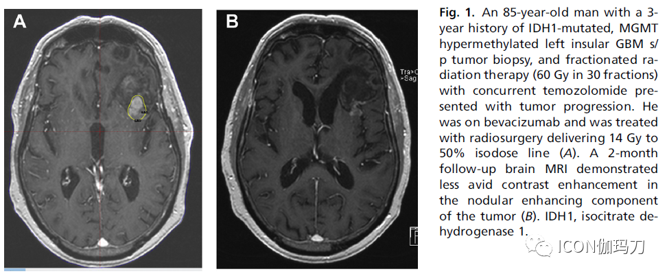 图1.一位85岁男性患者,左侧岛叶有IDH1突变、MGMT高甲基化GBM s/ p肿瘤活检史3年,出现肿瘤进展同步接受替莫唑胺和分割放射治疗(30次分割60Gy)。他服用贝伐单抗并接受放射外科治疗,给予14Gy至50%等剂量线(A)。2个月的随访脑部MRI显示肿瘤结节增强部分对比强化减弱;(B) IDH1异柠檬酸脱氢酶1。