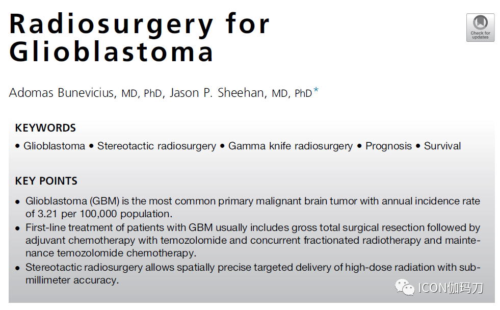 《Neurosurgery Clinics of North America》杂志 2021年 1月刊载美国University of Virginia Health System的Adomas Bunevicius, 和Jason P Sheehan撰写的综述《放射外科治疗胶质母细胞瘤。Radiosurgery for Glioblastoma》[32(1):117-128.] (doi: 10.1016/j.nec.2020.08.007. )。