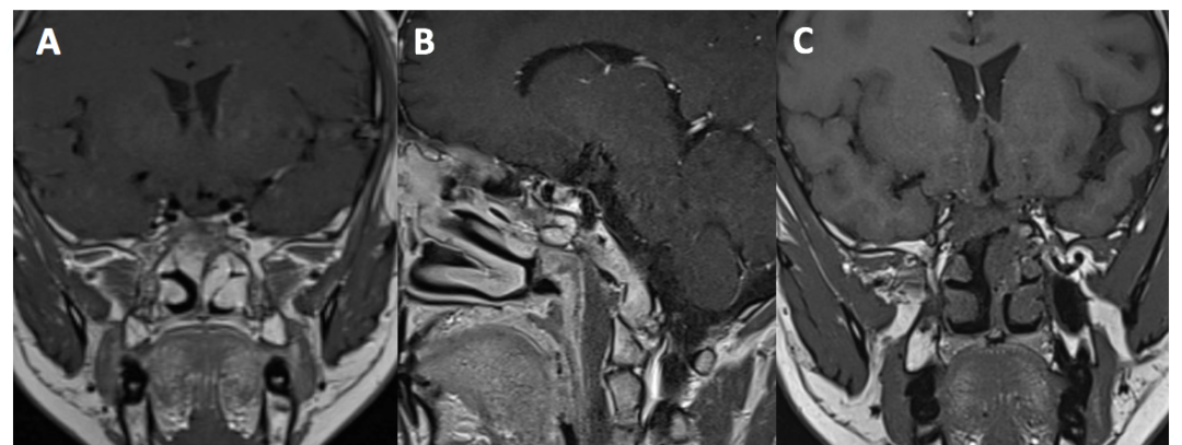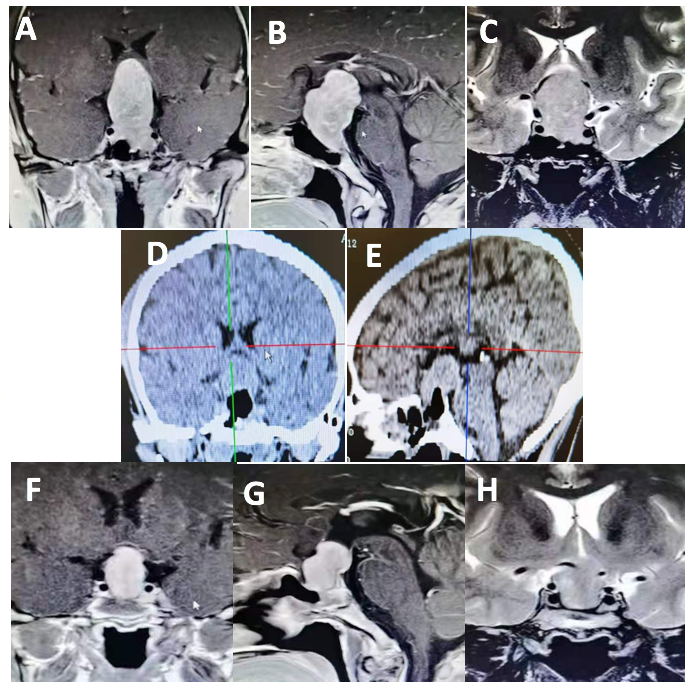 巨大垂体腺瘤(Giant Pituitary Adenoma,GPA)通常指的是直径大于4cm的垂体腺瘤,约占所有垂体腺瘤的5-15%[1]。因其占位效应明显,与颈内动脉、海绵窦、视神经及下丘脑关系密切,导致其手术难度大、风险高、全切困难。如何最大范围切除肿瘤并降低术后并发症,一直是神经外科面临的巨大挑战。巨大垂体腺瘤的手术入路可分为经蝶入路、开颅手术及联合入路三类,其中联合入路又分为开颅和经蝶入路联合切除肿瘤以及经蝶和开颅分期切除肿瘤。目前,神经内镜或显微镜下经蝶手术是大多数垂体腺瘤的标准治疗方法,其优势是脑损伤小,适用于突入鞍内的垂体腺瘤,缺点是术中合并出血止血困难,存在术后脑脊液漏的风险。开颅手术可以清楚地显露鞍上结构,能够最大化地切除肿瘤,视神经减压效果良好,适用于哑铃状腺瘤或突破鞍隔,向海绵窦方向延伸的肿瘤,缺点是对脑组织牵拉损伤较大,对视神经骚扰明显。联合入路则适用于肿瘤呈不对称外形或巨大肿瘤侵入中颅窝者,经颅与经蝶联合切除肿瘤能尽可能多地全切肿瘤。联合入路中,有外科医生提出分期Two step手术策略,即首先执行一次手术,然后数周或数月后执行第二次手术;也有外科医生同时经颅和经蝶联合手术单次切除肿瘤[2]。这些手术策略各有优缺点,因此个体化治疗和手术计划是必不可少的。