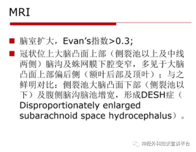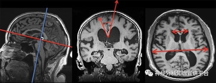 以上可以解释脑积水的一般情况,以下是几种特殊脑积水的发病机理:脑组织不是处处弹性一样,尤其在老年人中,脑组织的弹性大小不一的情况时有发生。这就导致脑室系统不均衡扩大,即DESH(Disproportionately enlarged subarachnoid space hydrocephalus,非对称性蛛网膜下腔脑积水),这一影像学特征是常压性脑积水特有表现。一般来说由于顶叶弹性较好,在一定压力差下可以发生移位,表现为脑室外膨,局部蛛网膜下腔受压,间隙消失,在冠状位上表现为CA(胼胝体角)小于90度;而其他脑组织弹性差的地方,相同的压力差不足以使脑组织发生位移,表现为脑室不外膨,局部蛛网膜下腔没有受压,间隙仍然存在。这种蛛网膜下腔的不对称性扩大就是DESH征。便于大家理解这一现象,可以引入两个概念:脑萎缩和脑压缩。顾名思义,前者是脑组织体积主动变小,多见于侧裂池、中脑环池周围的脑组织;后者是脑组织被动体积变小,多见于顶叶脑组织。当外界压力去除后,脑萎缩不会恢复,而脑压缩可以恢复之前的体积。这可以解释为什么常压性脑积水分流术后小便失禁和行走困难的缓解率明显高于痴呆的缓解率,因为前两者的中枢位于顶叶,而与痴呆密切相关的海马、杏仁核等边缘系统脑组织位于侧裂池、中脑环池周围。