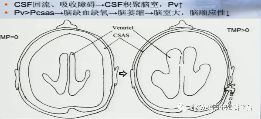 其一:脑组织弹性非常差,即使压力差再大,脑组织也不会发生移位,这一现象见于脑积水分流术后和颅内蛛网膜囊肿分流术后的裂隙脑室综合征,典型的表现就是即使存在极高的颅内压,脑室系统也不会扩大。笔者曾见过颅内压高达600mm水柱,而脑室没有扩大的病例。