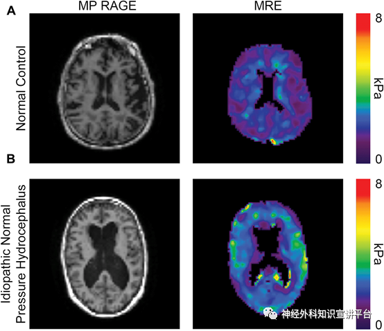 MRE(弹性磁共振)显示常压性脑积水病人局部脑组织弹性差,顺应性降低。